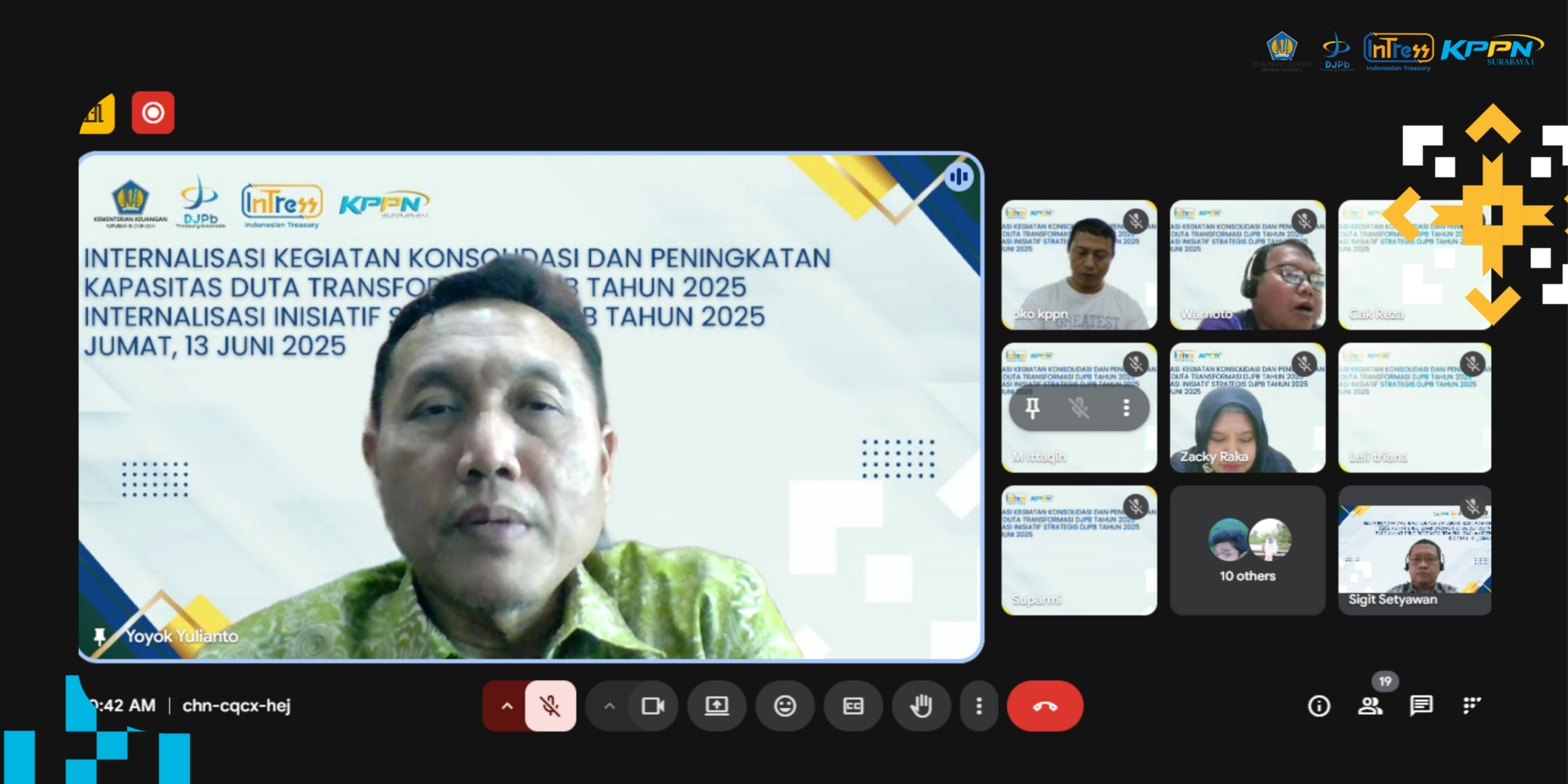 KPPN Surabaya I menyelenggarakan kegiatan Internalisasi Konsolidasi dan Peningkatan Kapasitas Duta Transformasi DJPb serta Internalisasi Strategis DJPb Tahun 2025 pada tanggal 13 Juni 2025. Acara dilakukan secara daring dan dihadiri oleh Kepala KPPN Surabaya I, pejabat pengawas, dan pegawai. Kegiatan ini bertujuan untuk memperkuat pemahaman pegawai tentang peran DJPb dalam mendukung pelaksanaan Reformasi Birokrasi dan Transformasi Kelembagaan di lingkungan Kementerian Keuangan. Dalam pembahasannya, Kepala KPPN Surabaya I, Bapak Yoyok Yulianto menekankan beberapa hal yakni Tantangan transformasi ekonomi dan optimalisasi APBN untuk mencapai pertumbuhan ekonomi berkelanjutan diantaranya target pertumbuhan ekonomi sebesar 8% yang dirasa membutuhkan transformasi ekonomi, peningkatan efisiensi investasi dan SDM, kemungkinan risiko gagal maju sebelum aging population, struktur APBN yang perlu dioptimalkan untuk meningkatkan produktifitas, serta bantuan sosial dan subsidi belum sepenuhnya tepat sasaran.