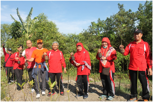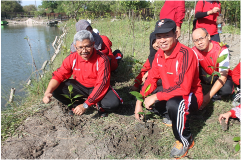 Selanjutnya adalah penanaman bibit pohon di sekitar lokasi hutan mangrove. Tiap orang mendapat satu bibit pohon untuk ditanam pada lubang yang telah disediakan. Para pegawai yang biasanya berurusan dengan kertas dan komputer kini harus belepotan tanah dan lumpur untuk menanam pohon. Walaupun demikian tidak terdengar keluh kesah atau segan. Dengan semangat serta ceria para pegawai bersama-sama menanam bibit pohon yaang mereka pegang ke dalam lubang. Dan selanjutnya menimbunnya dengan tanah. Bapak pemandu menjelaskan bahwa tanaman yang baru saja ditanam ini tidak perlu disirami. Karena lokasi penanaman terletak di tepian muara sungai. Sehingga saat air pasang akan mendapatkan siraman air.