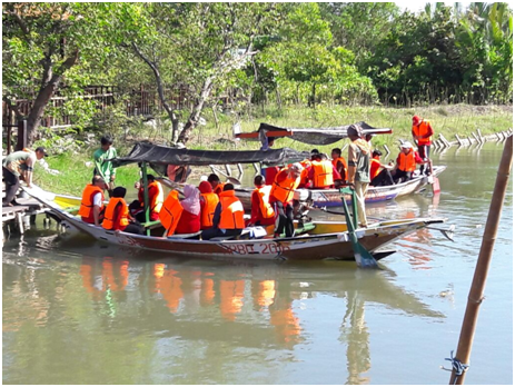 Setelah selesai, rombongan berjalan-jalan hingga menuju dermaga. Tampak beberapa perahu yang tertambat di dermaga. Bapak Pemandu kemudian mengajak rombongan untuk menaiki perahu menyusuri muara hingga ke tepi laut. Dengan menggunakan 2 perahu rombongan pejabat/pegawai menyusuri hutan mangrove.