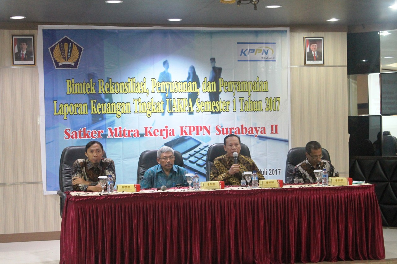 Sesuai Surat Keputusan Kepala KPPN Surabaya II Nomor KEP-3165/WPB.16/KP.135/2017 tanggal 06 Juli 2017 tentang Pembentukan Tim Kesekretariatan dan Narasumber Kegiatan Bimbingan Teknis Rekonsiliasi, Penyusunan dan Penyampaian Laporan Keuangan Tingkat UAKPA untuk Semester I Tahun 2017