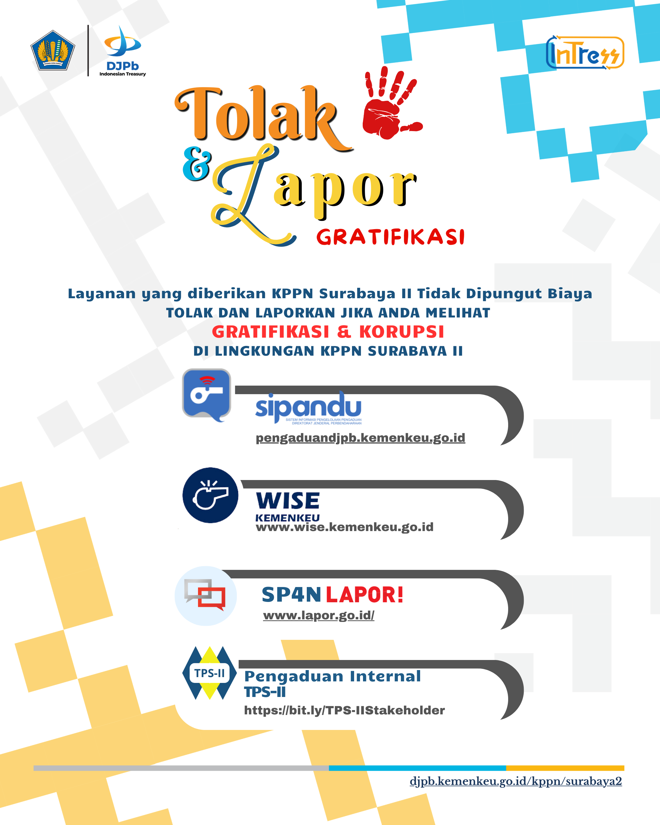 12 Feb,2025 Redaksi KPPN Berita Saluran Pengaduan KPPN Surabaya II - Tahun 2025 Apabila Anda mendapati Pelanggaran yang dilakukan pada KPPN Surabaya II, laporkan melalui : Sebelum Berikut