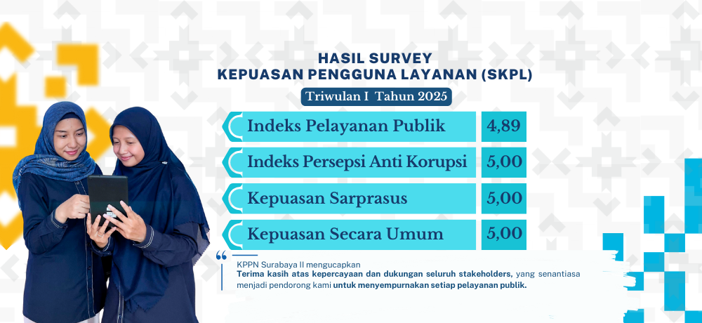 Terima kasih kami ucapkan atas dukungan dan kepercayaan seluruh Stakeholders KPPN Surabaya II. Setiap masukan yang Anda berikan sangat berarti bagi kami untuk terus berbenah agar senantiasa dapat memberikan pelayanan yang maksimal.