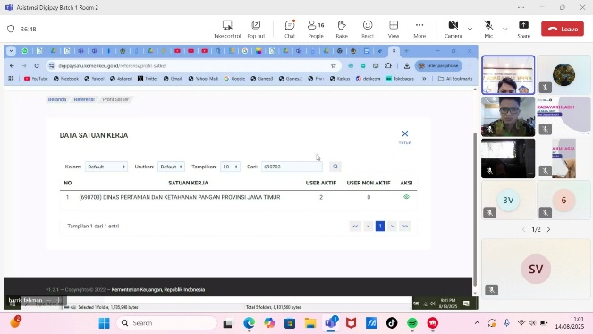 Setelah pemberian materi secara general, peserta acara dibagi ke dalam dua sesi ruang virtual meeting yang terpisah. Hal ini dilakukan untuk memberikan pendampingan dan konsultasi secara lebih insentif kepada satker yang memiliki kendala selama pendaftaran proses pendaftaran.