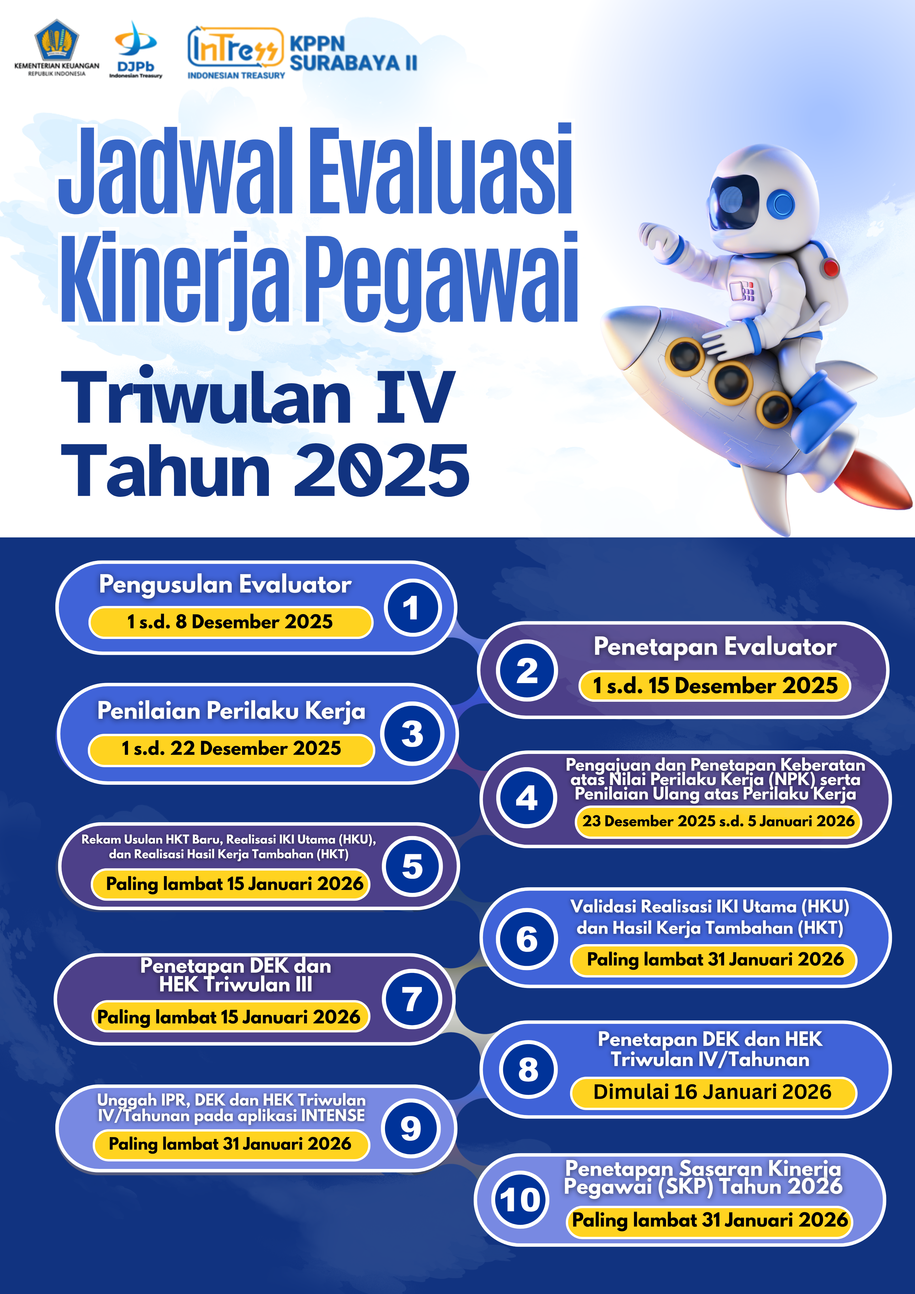 03 Des,2025 Redaksi KPPN Berita Jadwal Pelaksanaan Evaluasi Kinerja Triwulan IV Tahun 2025 Yuk Simal Jadwal Jadwal Pelaksanaan Evaluasi Kinerja Triwulan IV Tahun 2025 berikut ini. Jangan sampai terlewat yaa Sebelum Berikut