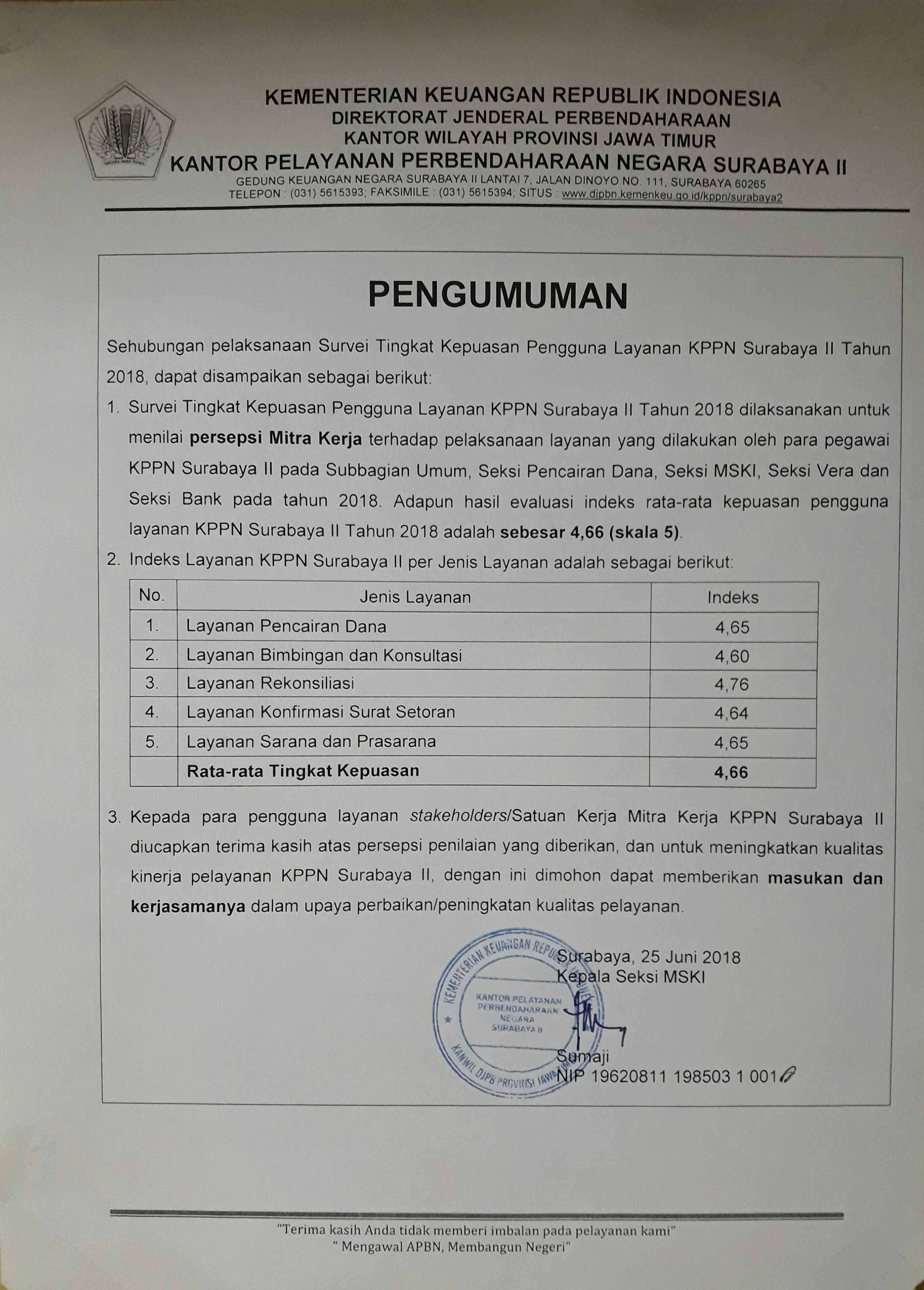 Sehubungan dengan pelaksanaan Survei Tingkat Kepuasan Pengguna Layanan KPPN Surabaya II Tahun 2018, dapat disampaikan hal-hal sebagai berikut :