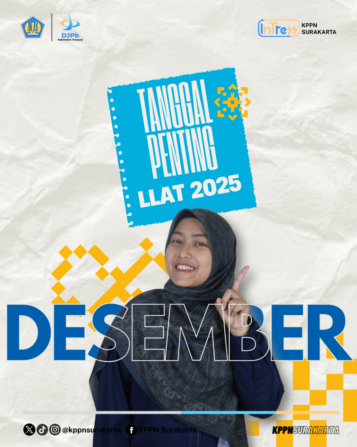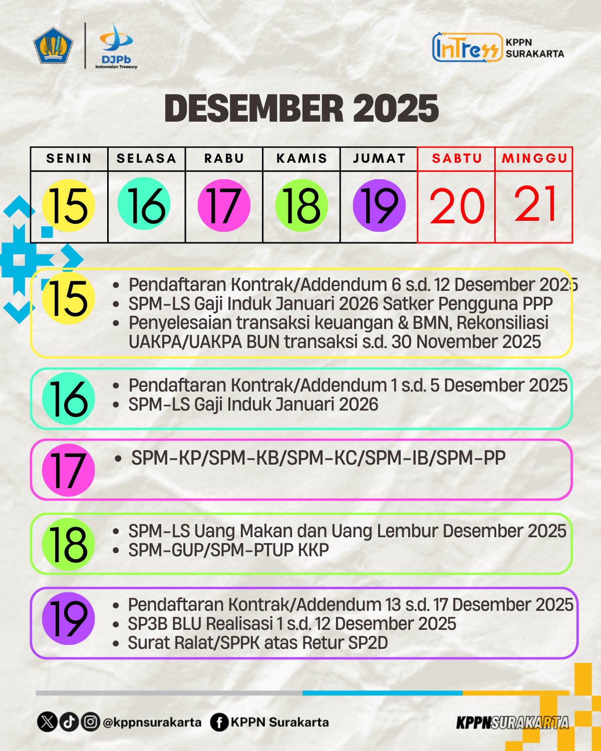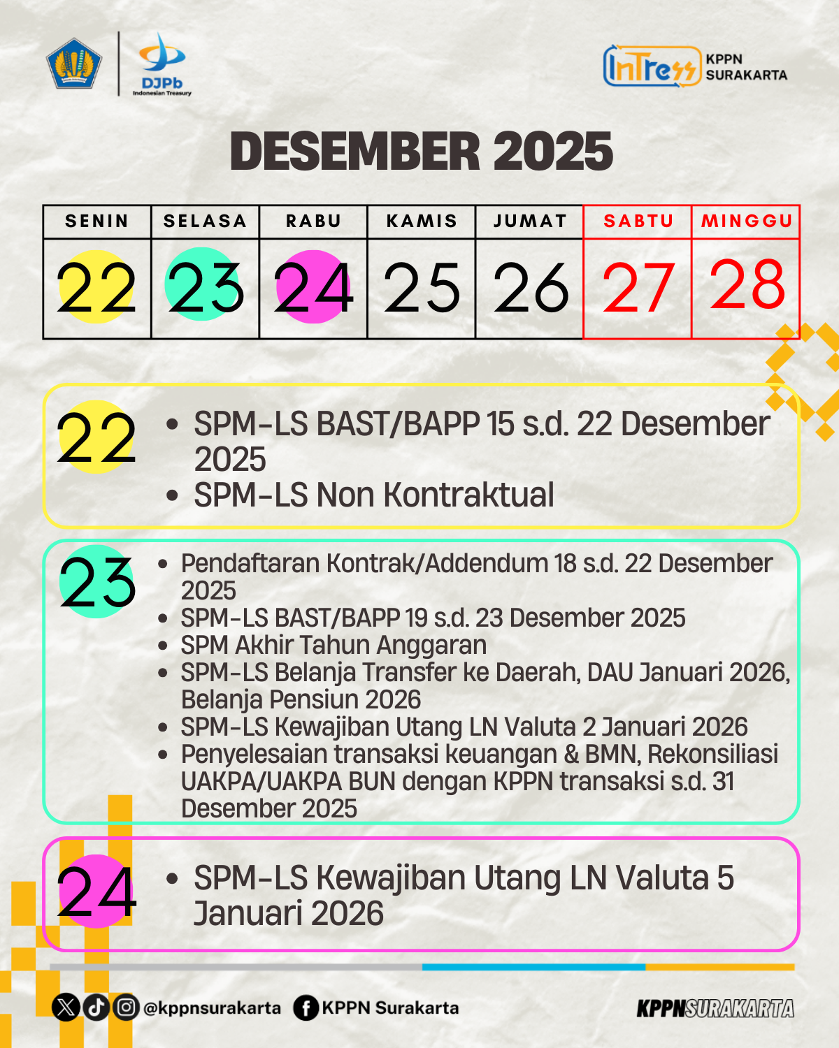 Surakarta - Memasuki bulan Desember 2025, ada beberapa tanggal penting yang perlu diperhatikan satuan kerja agar proses Langkah-langkah Akhir Tahun (LLAT) 2025 dapat berjalan lancar. Ketepatan waktu menjadi kunci agar pelaksanaan anggaran tetap tertib dan sesuai ketentuan.