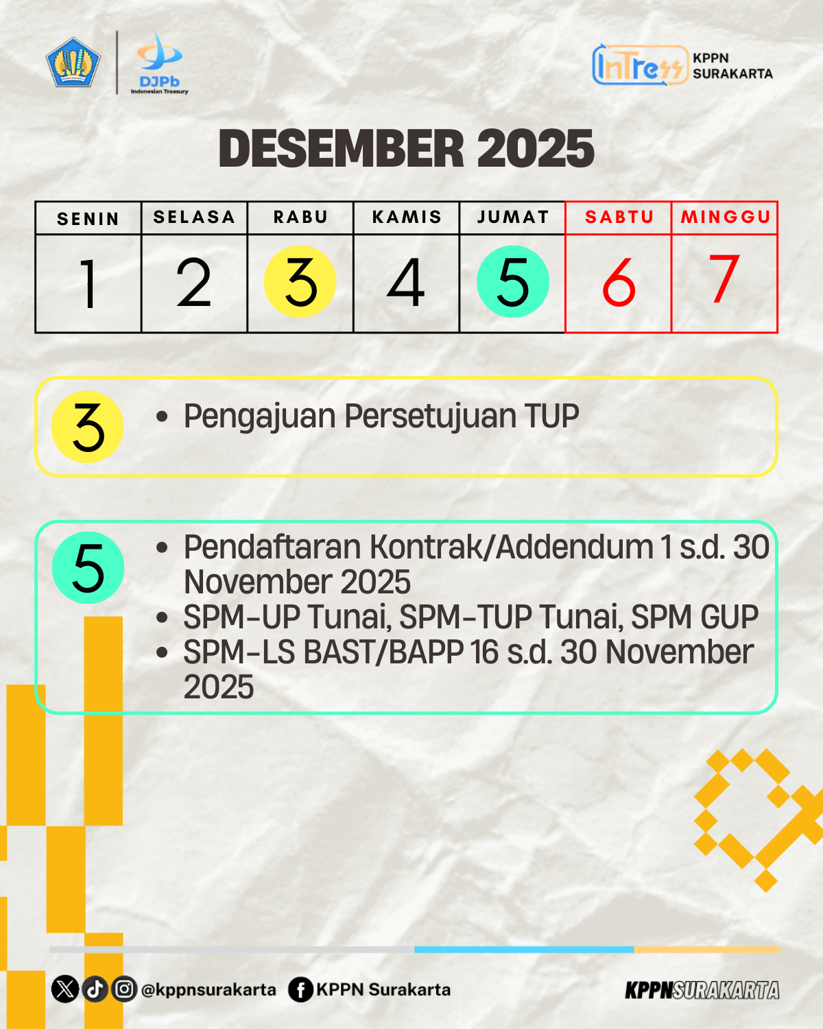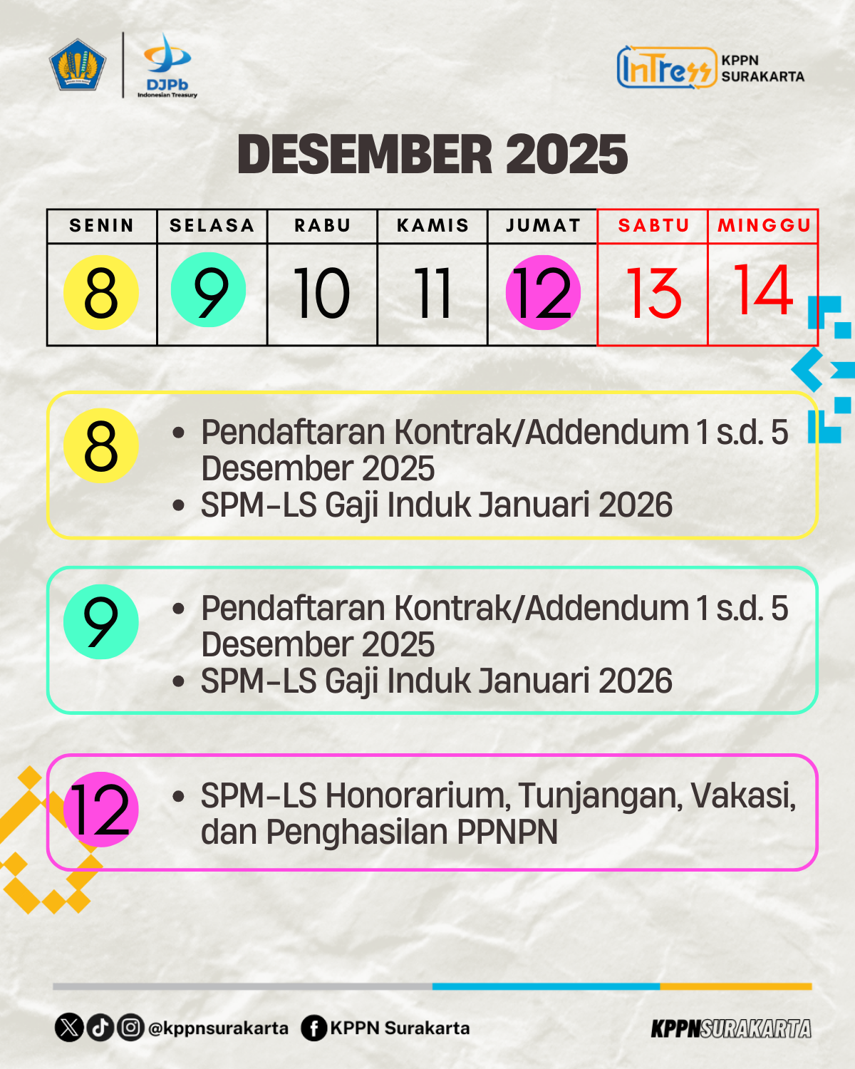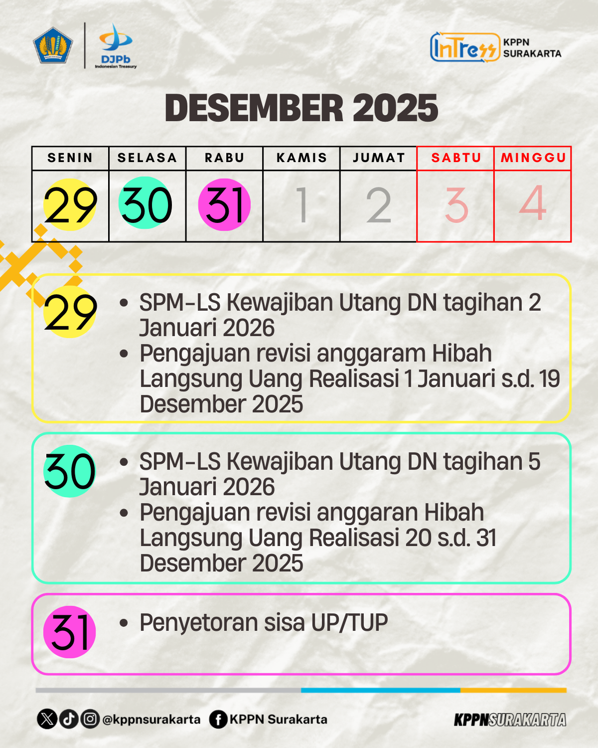 KPPN Surakarta telah merangkum tanggal-tanggal krusial yang wajib dicatat oleh seluruh satker. Pastikan memantau jadwal tersebut dengan cermat.