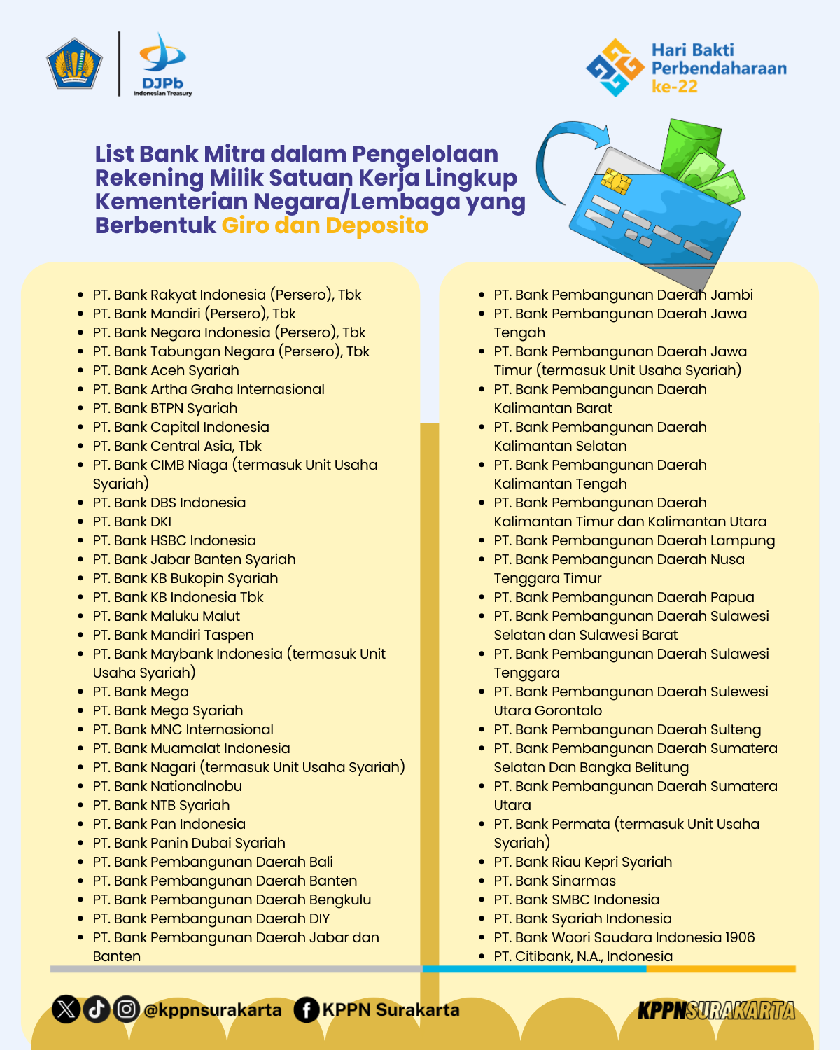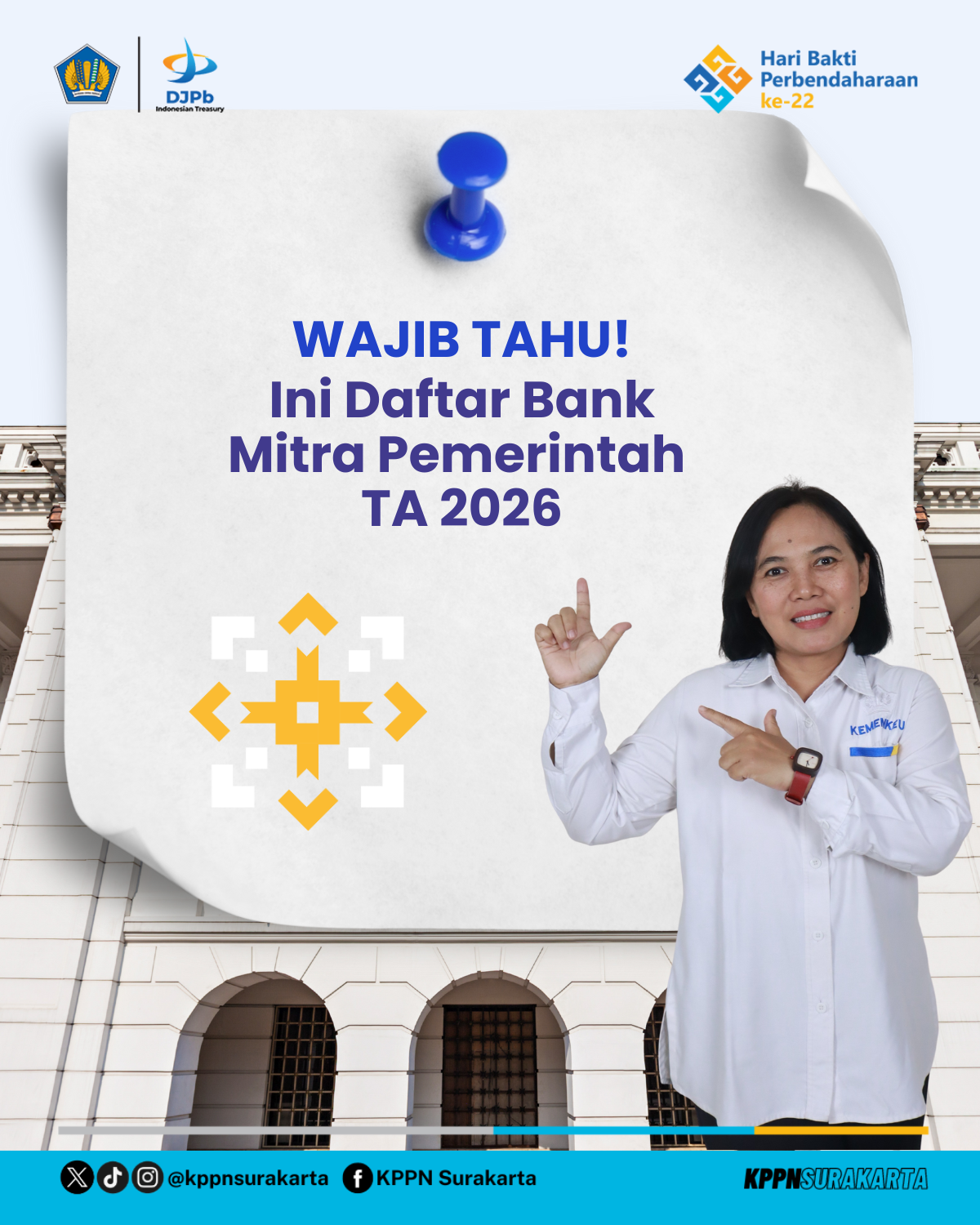 Surakarta - Dalam rangka mewujudkan pengelolaan keuangan negara yang tertib, akuntabel, transparan, dan sesuai ketentuan, Kementerian Keuangan Republik Indonesia melalui Direktorat Jenderal Perbendaharaan telah menetapkan Daftar Bank Umum Mitra Pemerintah dalam pengelolaan rekening milik Satuan Kerja (Satker) lingkup Kementerian Negara/Lembaga untuk Tahun Anggaran 2026.