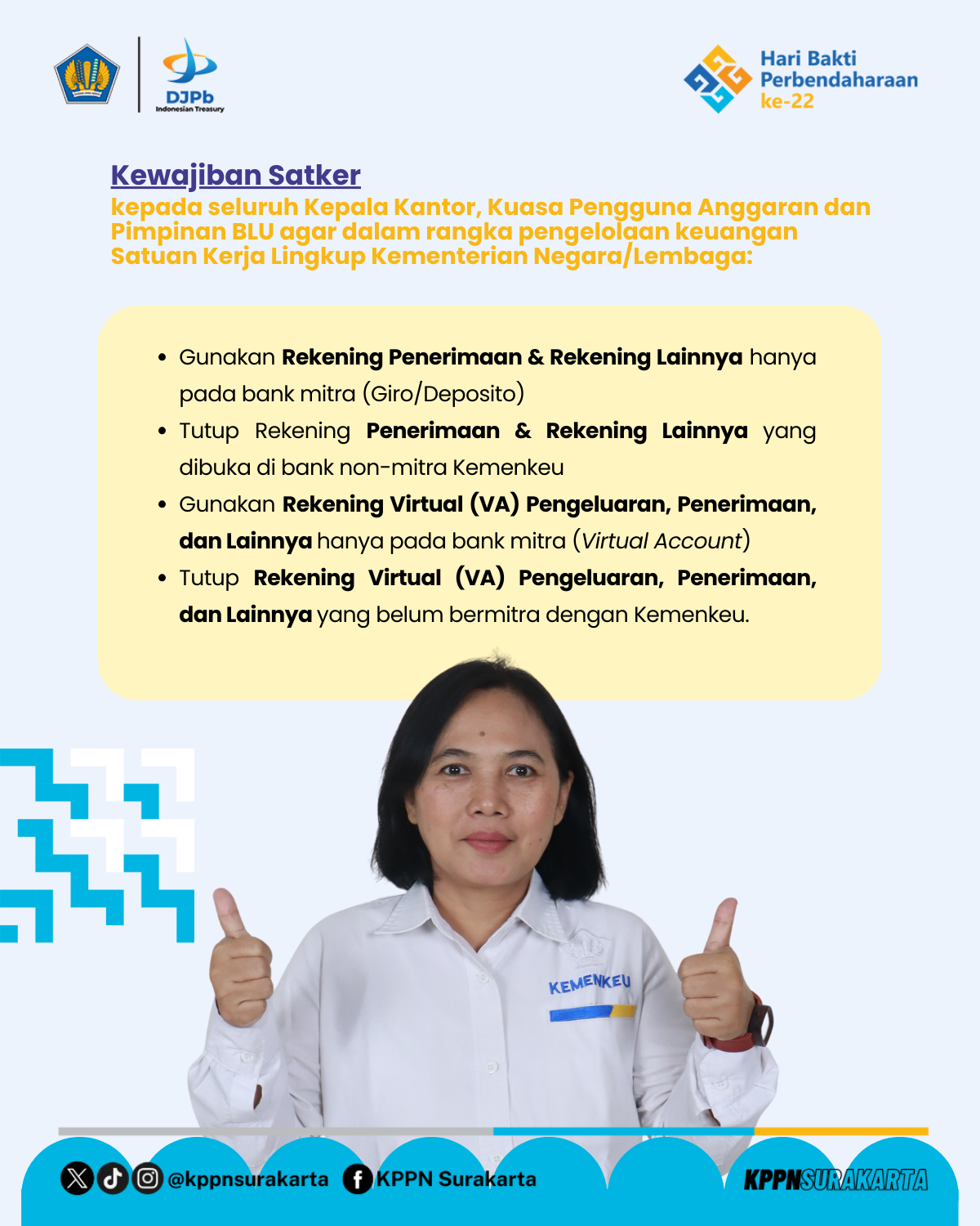 Satuan Kerja diharapkan untuk segera melakukan penyesuaian terhadap pengelolaan rekening yang dimiliki sesuai dengan ketentuan yang berlaku. Untuk informasi lebih lanjut dan pendampingan teknis, Satker dapat berkoordinasi dengan Kantor Pelayanan Perbendaharaan Negara (KPPN) setempat.