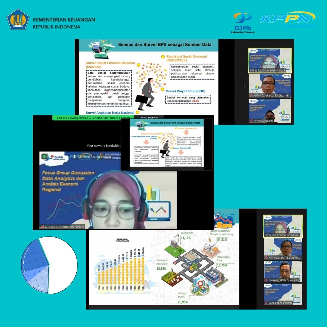 KPPN Surakarta, Kamis, 29 September 2022, Pagi yang cerah dengan kesegaran suasana konsep Fresh Office, seluruh pegawai KPPN Surakarta mengikuti Forum Group Discussion (FGD) Data Analytics dan Analisis Ekonomi Regional dengan tema "Indikator Ekonomi". FGD dilaksanakan secara daring via zoom meeting dengan narasumber Chomariah Fitriani, S.ST, M.Si dari Badan Pusat Statistik (BPS) Surakarta. Dalam FGD tersebut Chomariah memaparkan data inflasi, PDRB, pertumbihan ekonomi dan ekonomi Jawa Tengah dengan sangat jelas. Di penghujung FGD, Hartana, Kepala KPPN Surakarta juga menyampaikan data-data alokasi pagu dan realisasi sampai ke jenis belanja. Harapan dari FGD ini dapat terjalin kerjasama pemanfaatan data-data sebagai bahan analisis dalam kajian ekonomi regional.