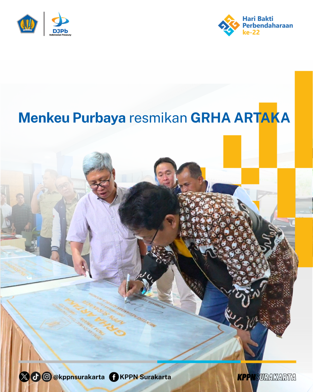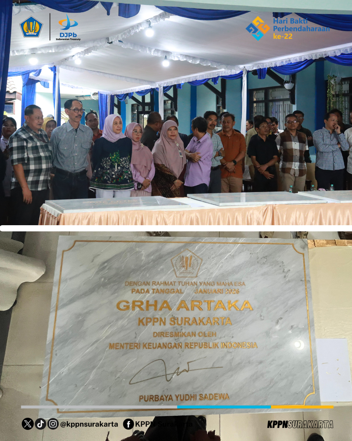 Surakarta - Kementerian Keuangan terus memperkuat dukungan sarana dan prasarana dalam rangka peningkatan kualitas layanan publik dan pengelolaan keuangan negara. Komitmen tersebut diwujudkan melalui peresmian revitalisasi Aula Grha Artaka di KPPN Surakarta serta Grha Perbendaharaan dan Treasury Learning Center (TLC) Reksobayan di lingkungan Kanwil DJPb D.I. Yogyakarta, yang peresmiannya terpusat di Magelang pada Sabtu, 24 Januari 2026. Peresmian tersebut dilakukan oleh Menteri Keuangan Republik Indonesia, Bapak Purbaya Yudhi Sadewa, dan menjadi tonggak penting dalam penguatan kualitas layanan publik di lingkungan perbendaharaan.