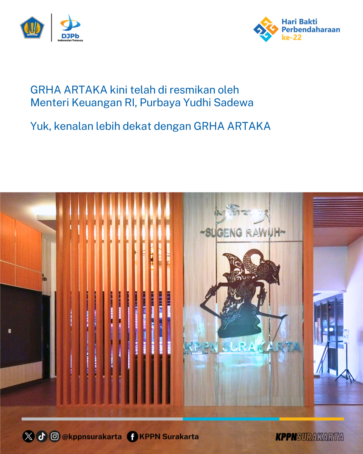 Melalui pemanfaatan Grha Artaka, KPPN Surakarta berharap fasilitas ini dapat memberikan manfaat nyata sebagai ruang kolaborasi bagi seluruh pemangku kepentingan, mendukung peningkatan kualitas layanan, serta mendorong terwujudnya pengelolaan keuangan negara yang semakin profesional dan berintegritas.