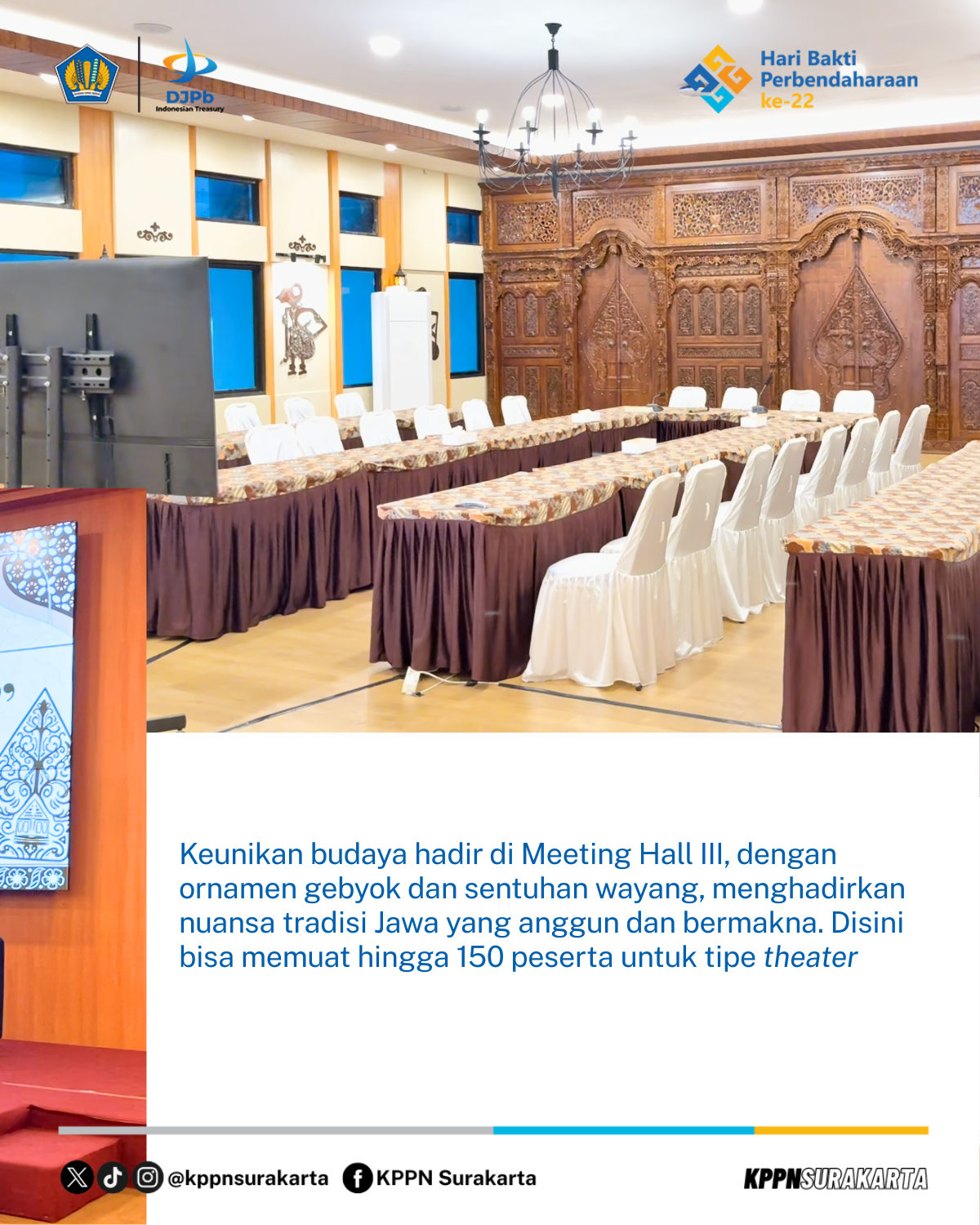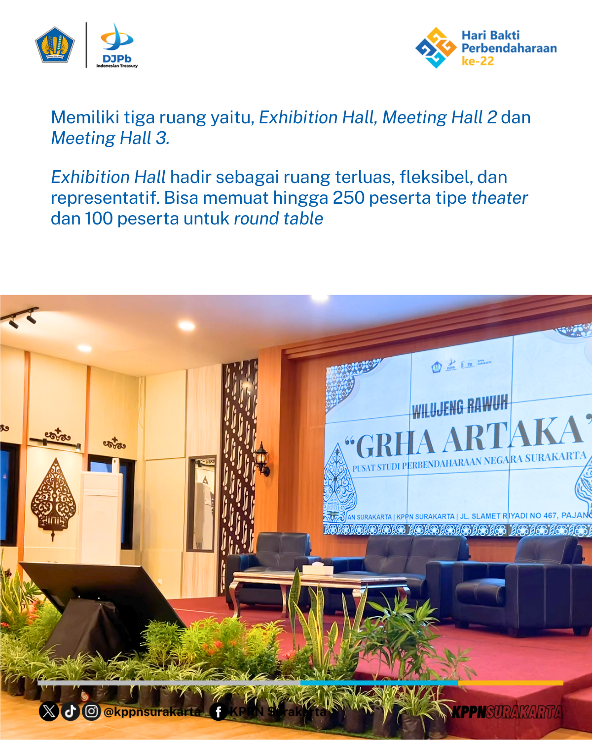 Revitalisasi Aula Grha Artaka mencerminkan komitmen Kementerian Keuangan, khususnya Direktorat Jenderal Perbendaharaan, dalam menghadirkan fasilitas yang representatif, modern, dan adaptif terhadap kebutuhan layanan serta kegiatan kelembagaan di wilayah Surakarta dan sekitarnya. Aula ini dirancang untuk mendukung berbagai aktivitas, mulai dari koordinasi, sosialisasi kebijakan, hingga kegiatan edukasi dan penguatan kapasitas sumber daya manusia.