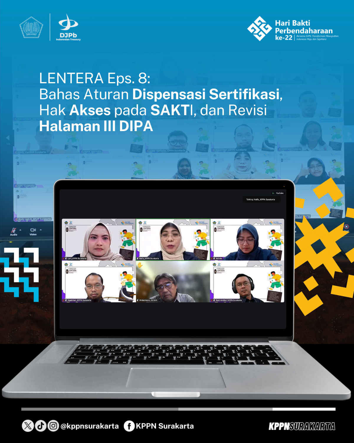 Bagi satker yang belum sempat mengikuti kegiatan secara langsung, materi LENTERA Episode 8 dapat disaksikan kembali melalui channel YouTube KPPN Surakarta pada link berikut: