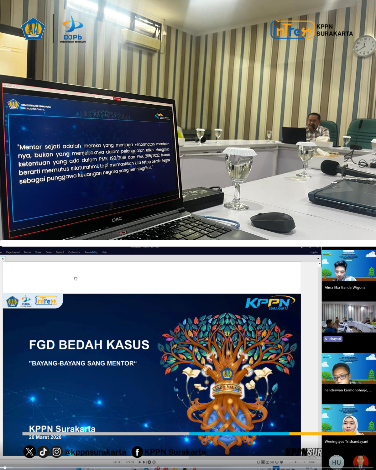Surakarta — Bertempat di Ruang Rapat KPPN Surakarta, Kantor Pelayanan Perbendaharaan Negara (KPPN) Surakarta menyelenggarakan kegiatan Focus Group Discussion (FGD) Pembinaan Mental Bidang Kompetensi dengan tema "Integritas dan Konflik Kepentingan dalam Kepemimpinan Organisasi". Kegiatan yang berlangsung pada Kamis, 26 Maret 2026 ini dilaksanakan secara hybrid, mengombinasikan kehadiran fisik di kantor dan partisipasi daring melalui MS Teams bagi pegawai yang sedang menjalankan tugas Work From Home (WFH).