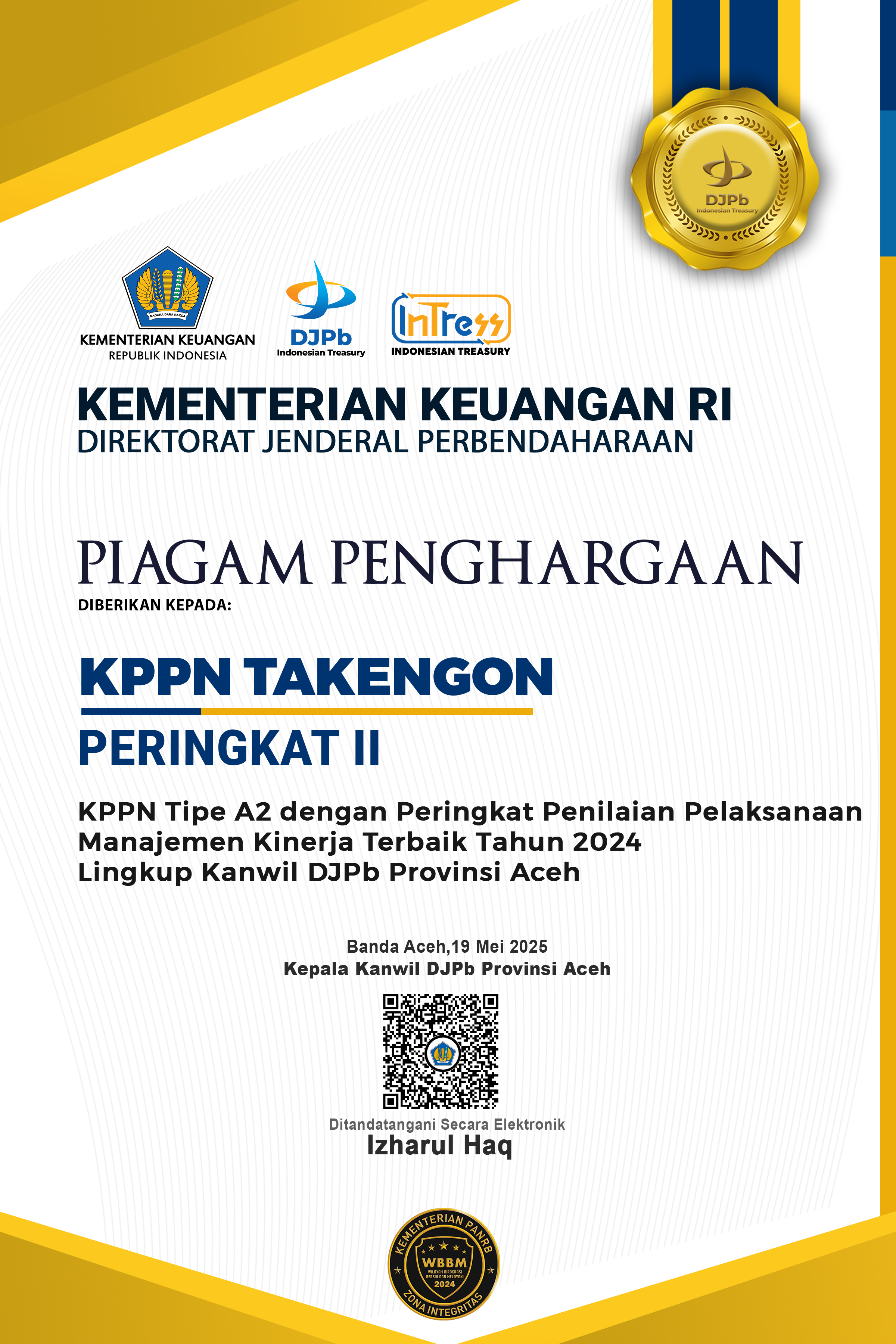 Peringkat II KPPN Tipe A2 dengan Peringkat Penilaian Pelaksanaan Manajemen Kinerja Terbaik Tahun 2024 Lingkup Kanwil DJPb Provinsi Aceh