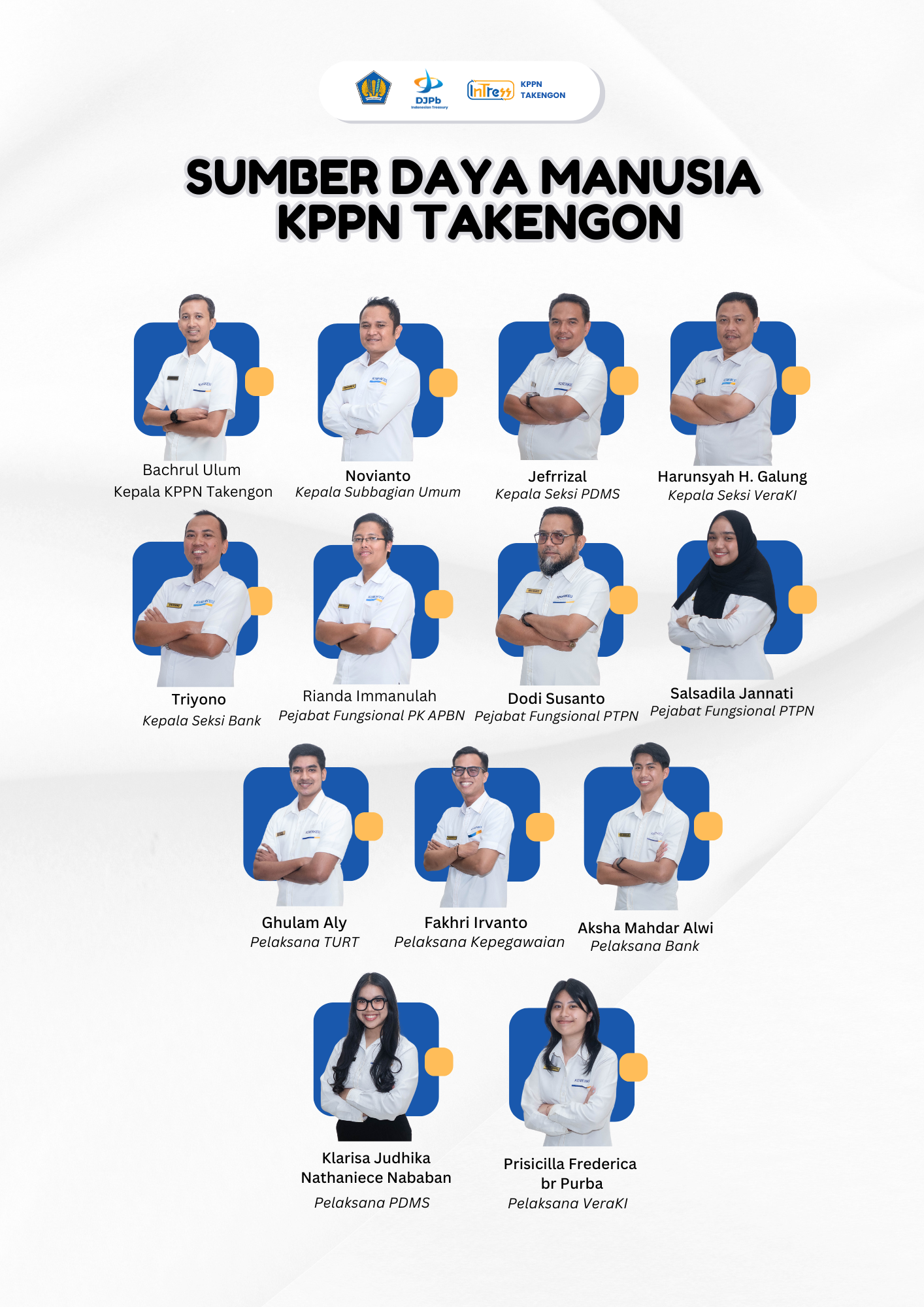 Dengan Sumber Daya manusia (SDM) dan infrastruktur yang handal dan berkualitas, kami percaya dan mampu untuk dapat menyelesaikan semua layanan sesuai dengan tuntutan mutu mitra kerja secara tepat waktu. Melalui training dan pelatihan-pelatihan, kami selalu berusaha untuk melakukan pengembangan sumber daya manusia secara konsisten dari tahun ke tahun. Sumber saya manusia memegang peranan penting dalam mewujudkan suatu tujuan, demikian juga dengan KPPN. Terdapat 13 (Tigabelas) pegawai yang tercatat dalam daftar pegawai KPPN Takengon, dipimpin oleh 1 (satu) orang Kepala Kantor, 1 (satu) orang Kepala Sub Bagian Umum, 3 (tiga) orang Kepala Seksi, 3 (tiga) orang Pejabat Fungsional serta 5 (lima) orang pelaksana. Semua pegawai dapat melaksanakan tugas dan fungsinya secara profesional dan handal.