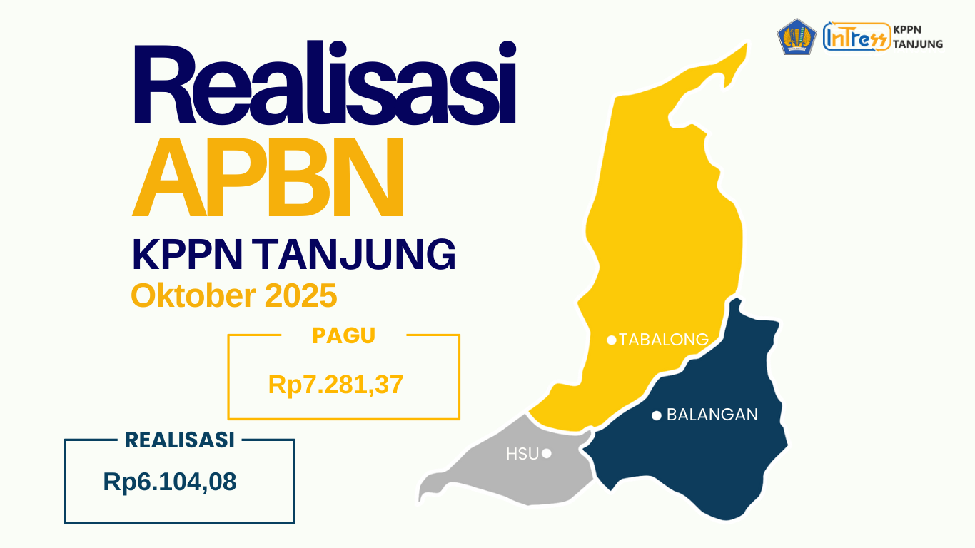 Kantor Pelayanan Perbendaharaan Negara (KPPN) Tanjung melaporkan realisasi Anggaran Pendapatan dan Belanja Negara (APBN) Tahun 2025 hingga 31 Oktober mencapai Rp6.104,08 miliar dari total pagu anggaran sebesar Rp7.281,37 miliar.