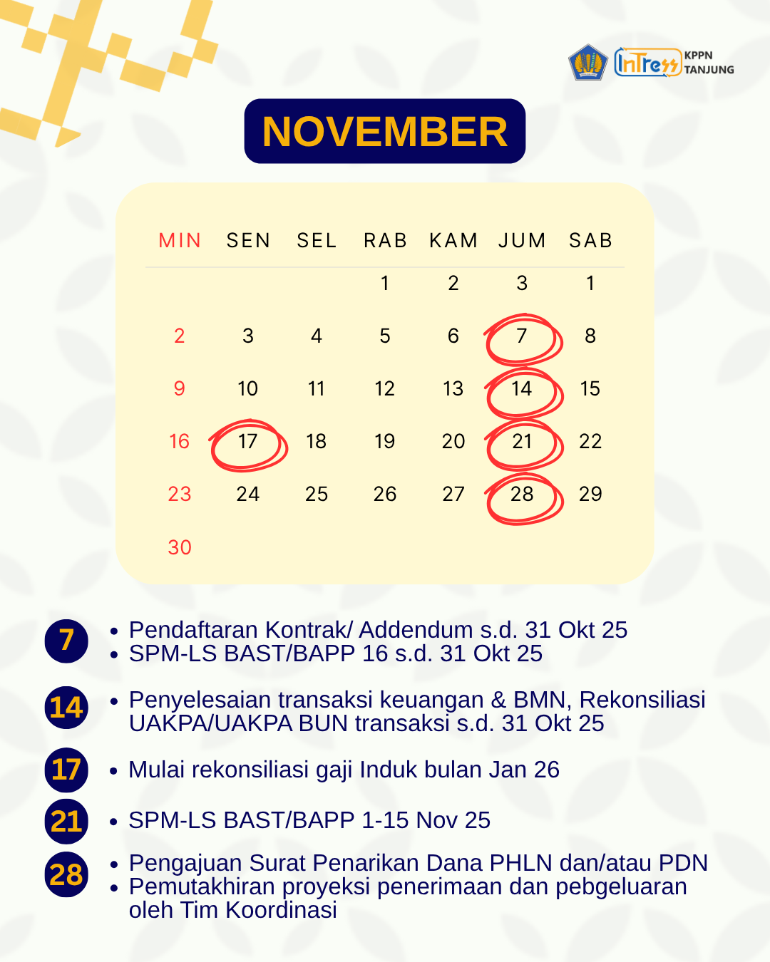 Halo Sobat 151, berikut ini tanggal-tanggal penting pada akhir Tahun Anggaran 2025 dibulan November yang perlu diperhatikan oleh seluruh satuan kerja. Catat dan jangan sampai terlewat ya! 🙌