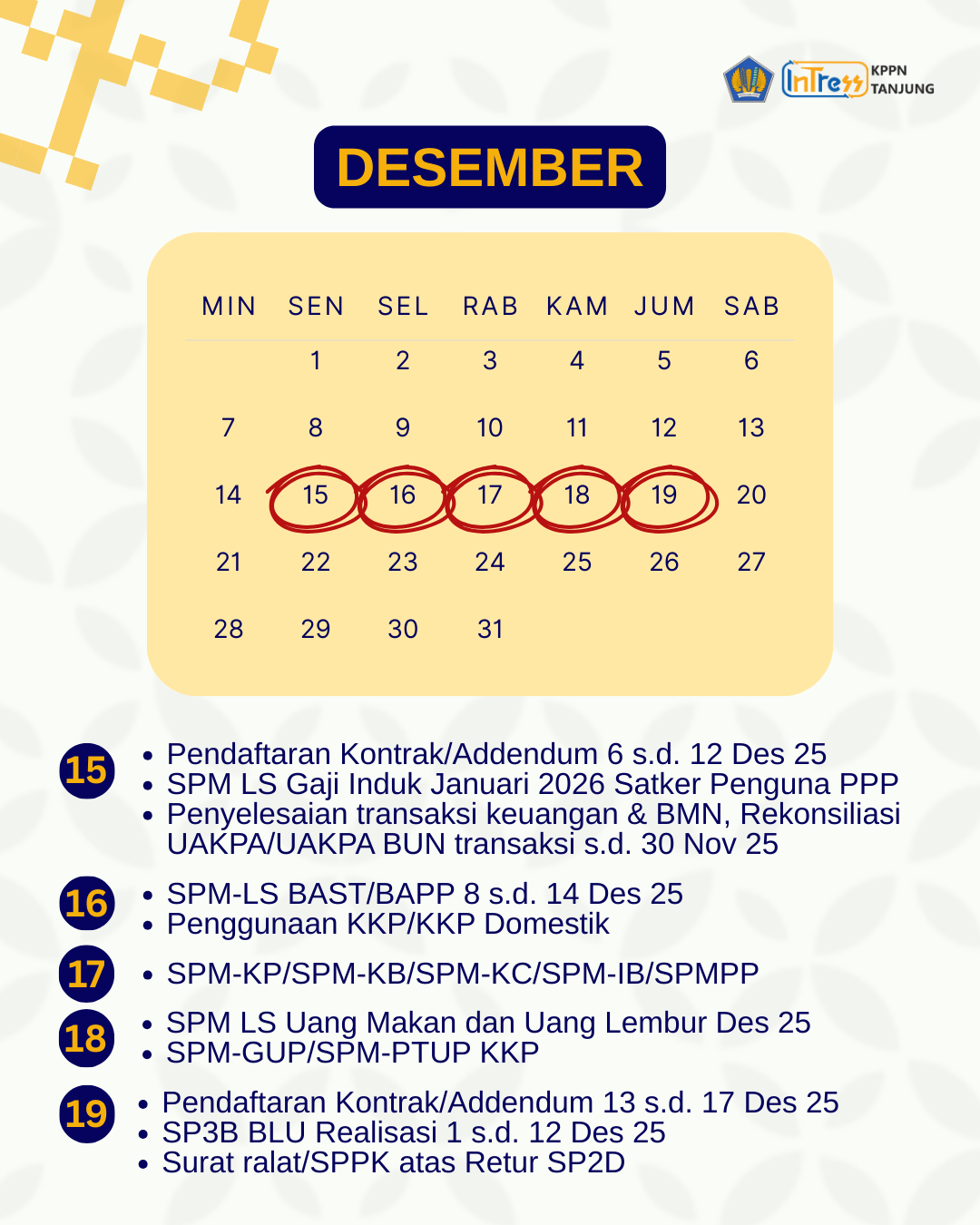 Halo Sobat 151, berikut ini tanggal-tanggal penting pada akhir Tahun Anggaran 2025 untuk ketiga di Bulan Desember yang perlu diperhatikan oleh seluruh satuan kerja. Catat dan jangan sampai terlewat ya! 🙌