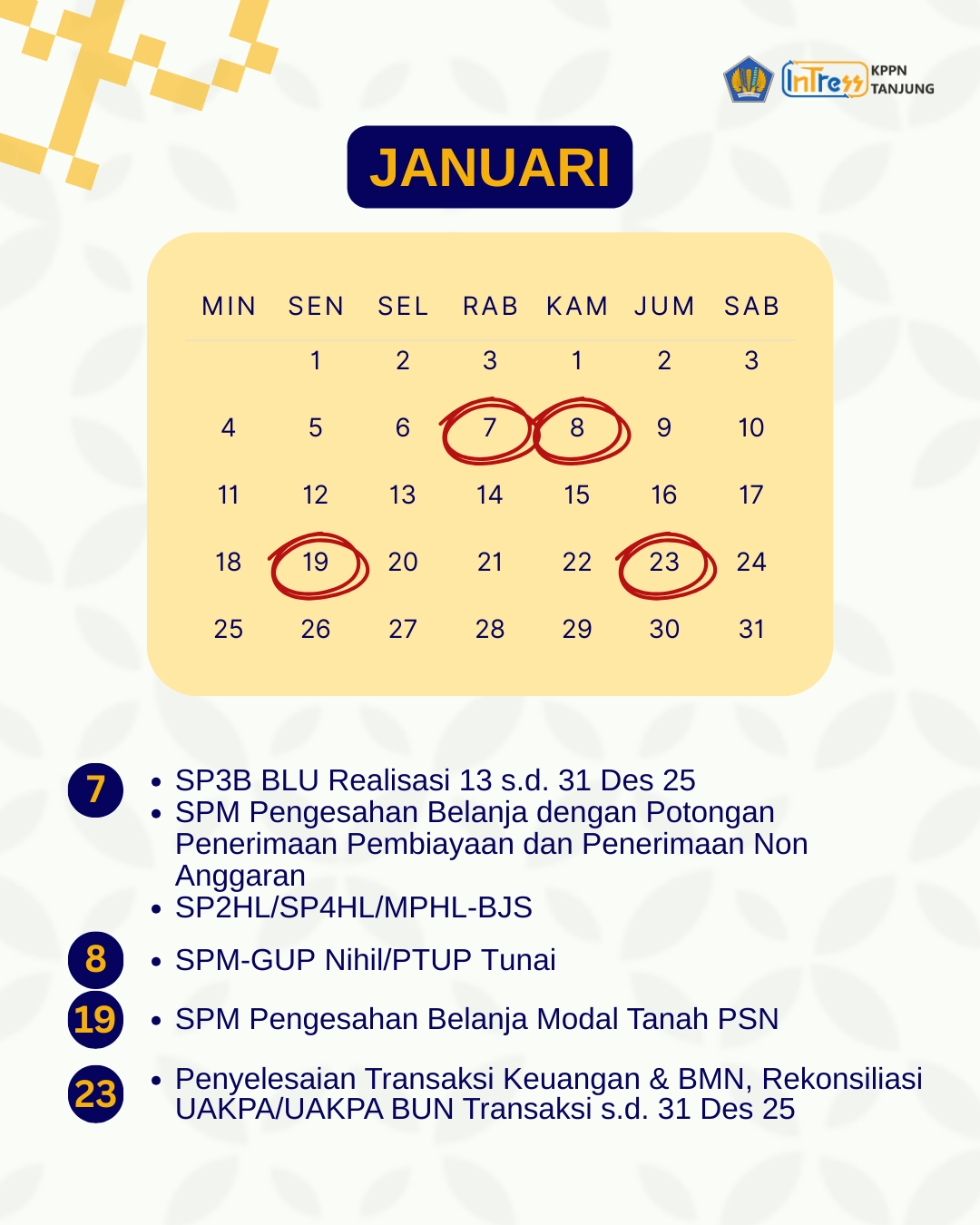 Halo Sobat 151, berikut ini tanggal-tanggal penting pada Langkah-Langkah Akhir Tahun Anggaran 2025 di bulan Januari yang perlu diperhatikan oleh seluruh satuan kerja. Catat dan jangan sampai terlewat ya! 🙌