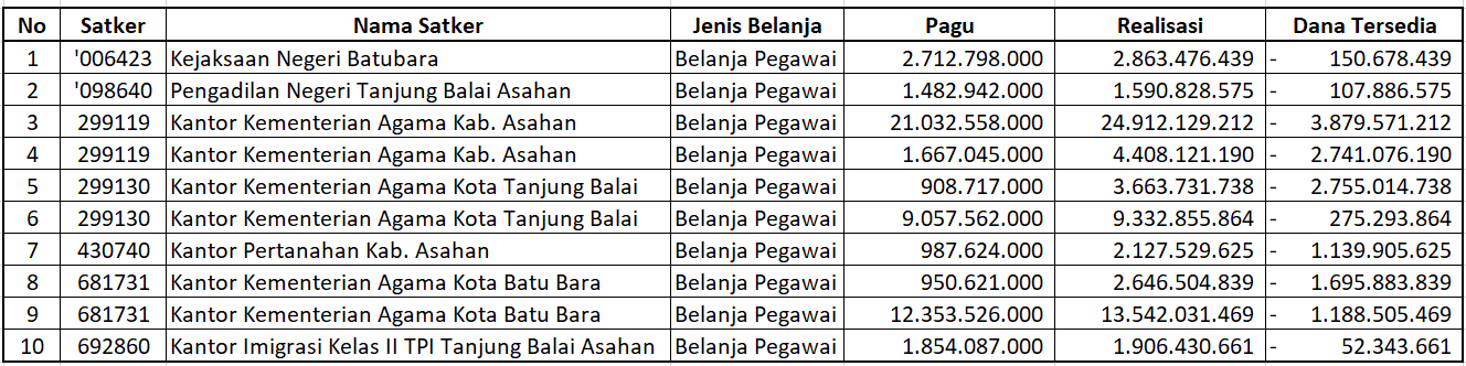 Pada pertengahan tahun 2025 (Juni s.d. Agustus 2025), terdapat pengangkatan dan pelantikan PNS dan PPPK di lingkungan Kementerian Negara/Lembaga (K/L) dan berdampak besar terhadap belanja pegawai. Indikator dampak yang dapat dilihat, salah satunya adalah terdapat pagu minus belanja pegawai pada Satuan Kerja (Satker) K/L. Pagu minus terjadi ketika pagu anggaran Satker sebetulnya tidak mencukupi untuk membiayai kegiatan baik operasional maupun non-operasional Satker yang bersangkutan, namun realisasi anggarannya telah terlebih dahulu dicairkan sehingga melebihi pagu anggarannya. Berdasarkan Monitoring Belanja Pegawai pada minggu Ketiga September 2025, terdapat 7 (Satker) Mitra KPPN Tanjung Balai yang mengalami pagu minus belanja pegawai.