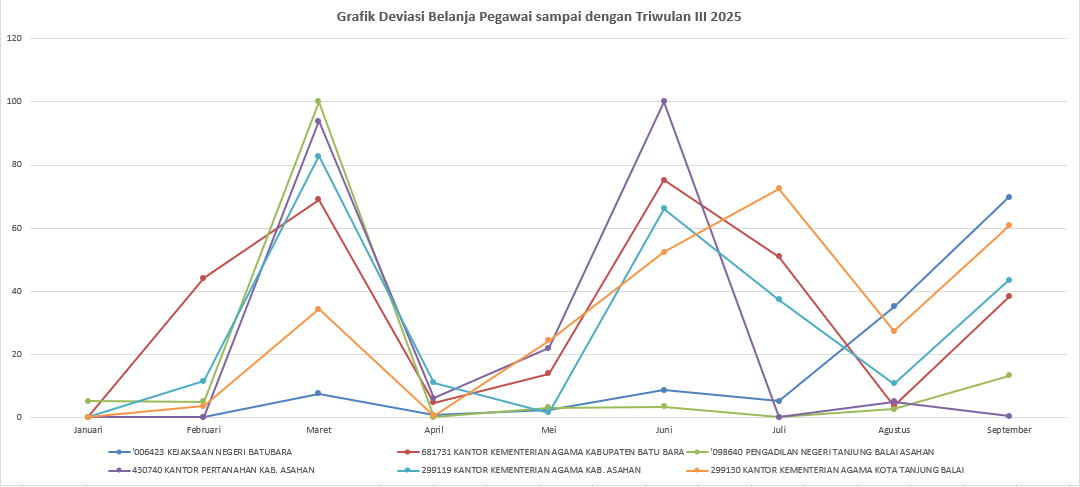 Penelusuran lebih lanjut menunjukkan deviasi halaman III DIPA terjadi pada bulan Juni 2025 ketika pengangkatan dan pelantikan ASN K/L dan Bulan September 2025 setelah terjadinya pagu minus yang dapat terlihat pada grafik berikut: