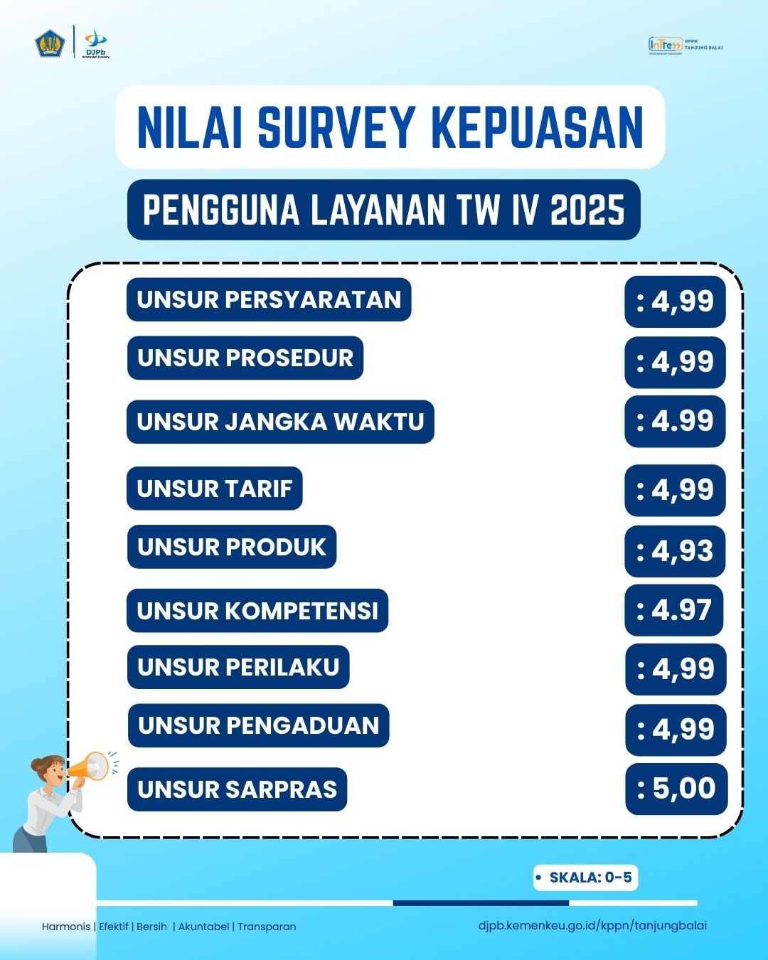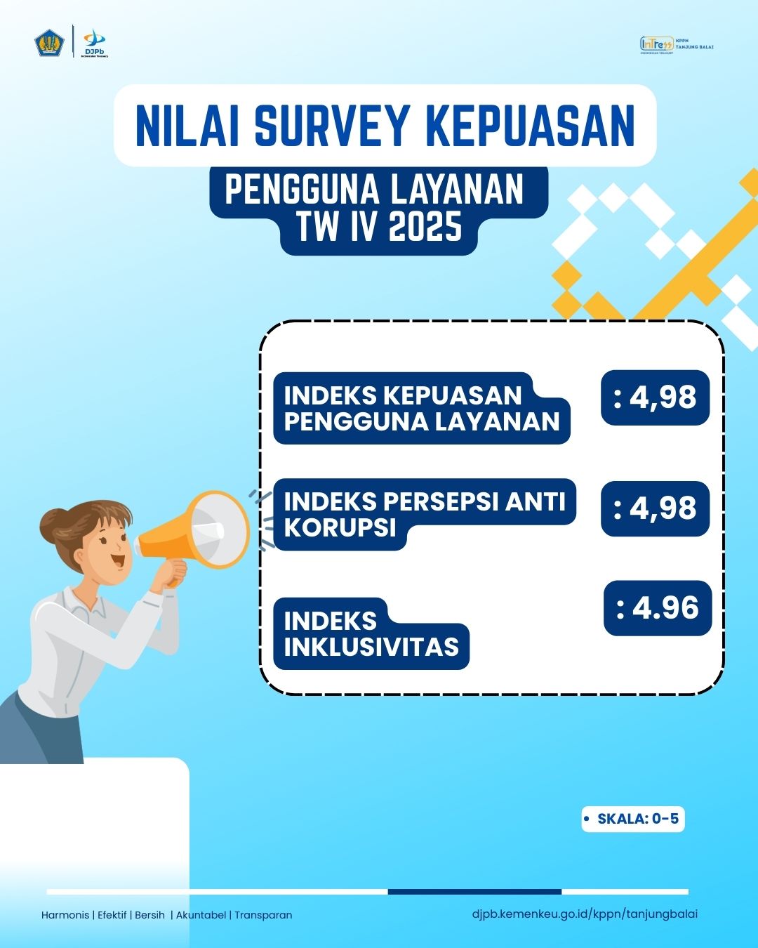 Pengumuman 19 Jan,2026 Pengumuman Survey Kepuasan Pengguna Layanan pada Triwulan IV Tahun 2025 KPPN Tanjung Balai telah melaksanakan Survey Kepuasan Pengguna Layanan pada Triwulan IV Tahun 2025 dengan perolehan indeks kepuasan 4,98. KPPN Tanjung Balai akan terus mempertahankan dan meningkatkan kualitas pelayanan kepada stakeholder. #kppntanjungbalaihebat Berikut