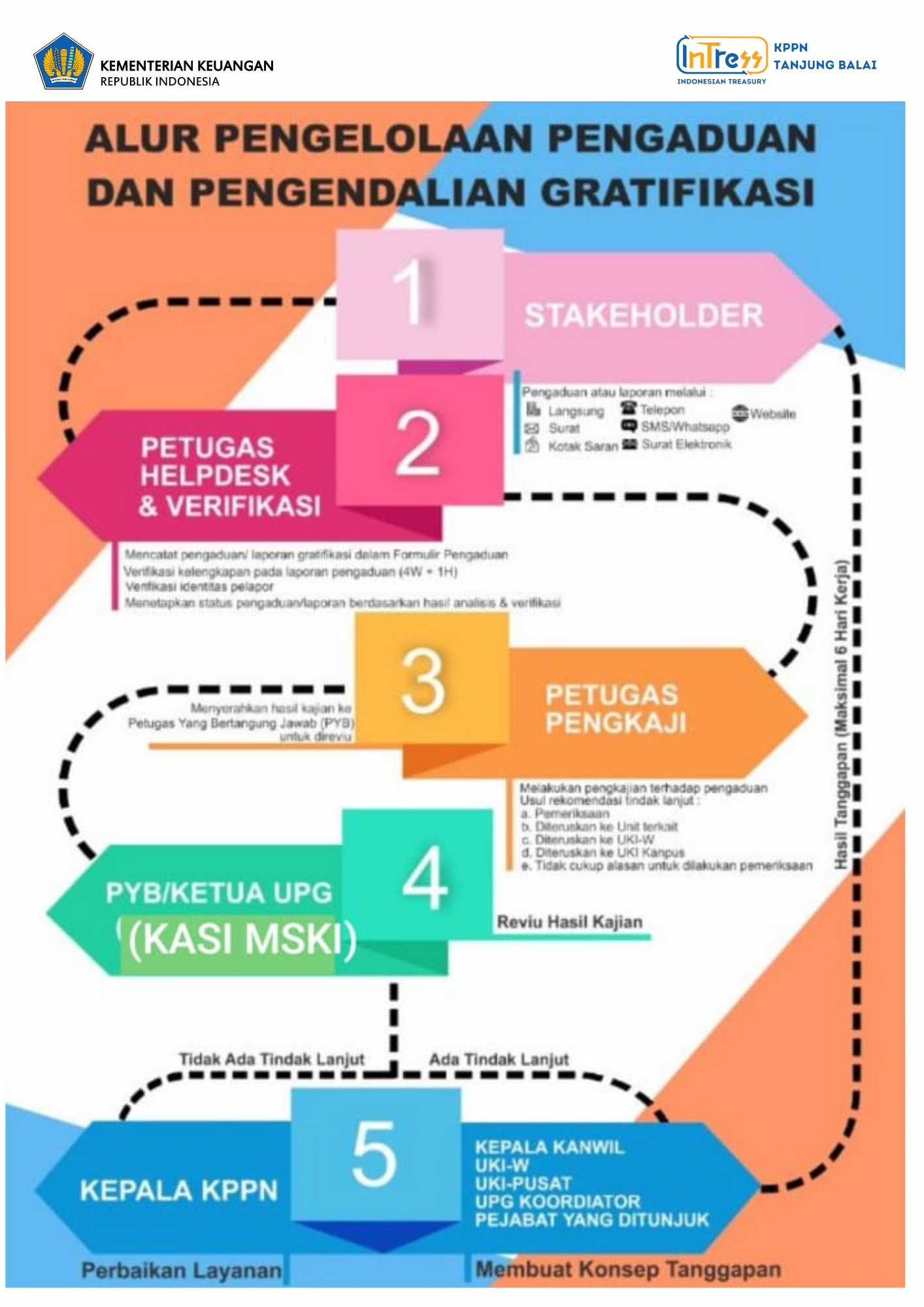 Sesuai dengan Peraturan Direktur Jenderal Perbendaharaan Nomor PER-3/PB/2013, berikut kami sampaikan alur pengaduan pada KPPN Tanjung Balai.