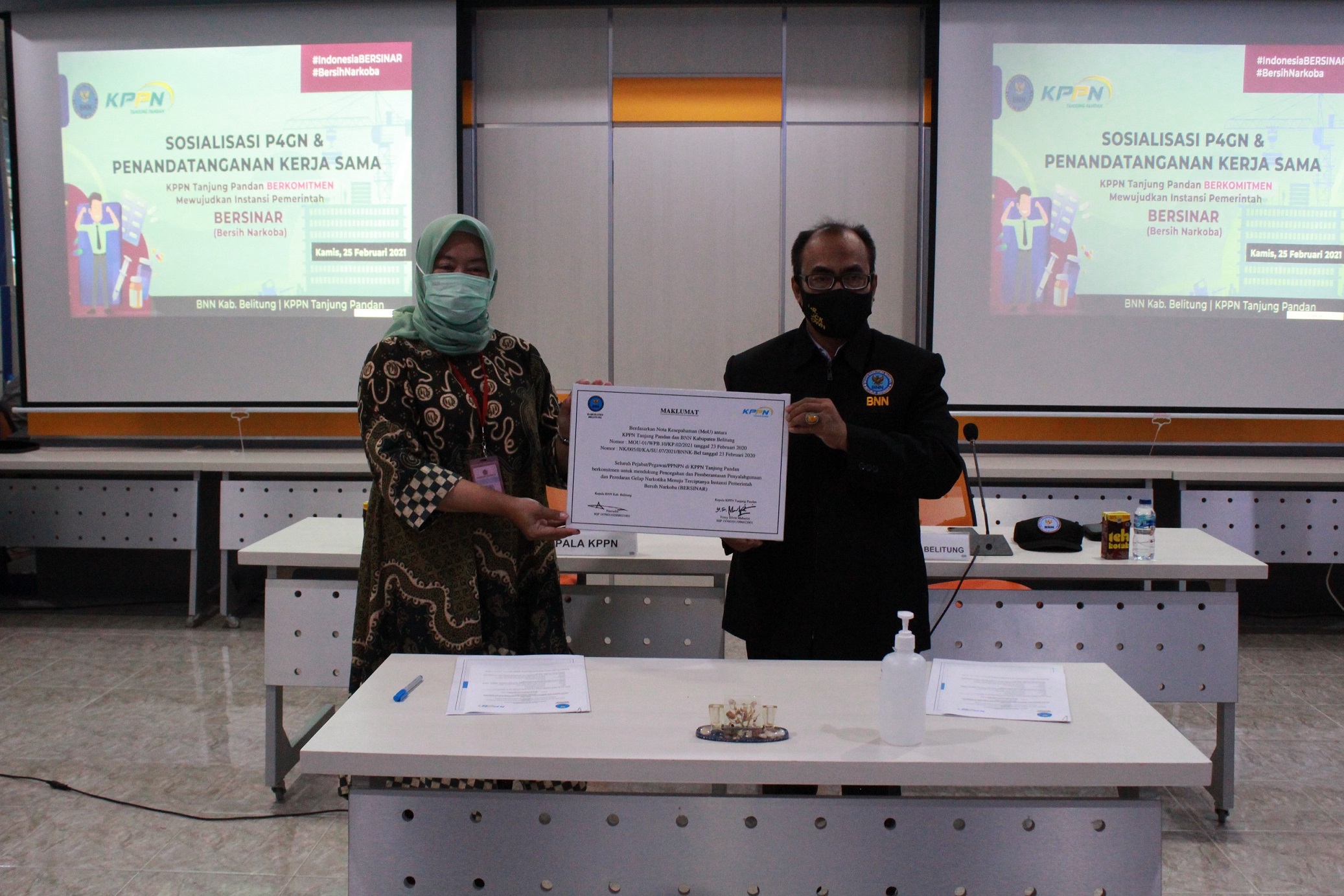 Dengan melakukan Sosialisasi Bahaya Penyalahgunaan Narkoba oleh BNN Kab. Belitung di salah satu instansi pemerintah KPPN Tipe A2 Tanjung Pandan. Sosialisasi dilaksanakan pada Kamis, 25 Februari 2021 pukul 16.00 WIB. bertempat di Aula KPPN Tanjung Pandan. Disertai dengan penandatangan maklumat yang diwakili oleh Kepala Kantor KPPN Tanjung Pandan dan Kepala kantor BNN Kab. Belitung yang isinya “Kesepakatan untuk berkomitmen mewujudkan instansi pemerintah BERSINAR (Bersih Narkoba)”.
