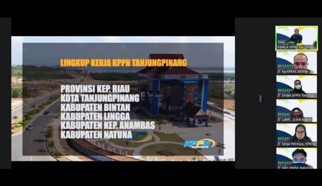 Melalui media Zoom Meeting, KPPN Tanjungpinang kembali memberikan asistensi dan replikasi inovasi persiapan menghadapi Penilaian Wilayah Bebas dari Korupsi (WBK) kepada satker Kantor Pelayanan Kekayaan Negara dan Lelang (KPKNL) Batam. Kantor KPKNL ini sedang mempersiapkan diri menghadapi penilaian akhir guna meraih predikat WBK dari Kementerian Pendayagunaan Aparatur Negara dan Reformasi Birokrasi (KemenPANRB). Kegiatan asistensi dan replikasi inovasi ini dilaksanakan kemarin, Selasa (3/8/2021) yang diikuti oleh seluruh Pegawai KPKNL Batam sebanyak 34 pegawai, turut hadir Kepala KPKNL Batam, Anton Listyanto. Sementara yang bertindak sebagai narasumber adalah Kepala Kantor Pelayanan Perbendaharaan Negara (KPPN) Tanjungpinang dan staf.