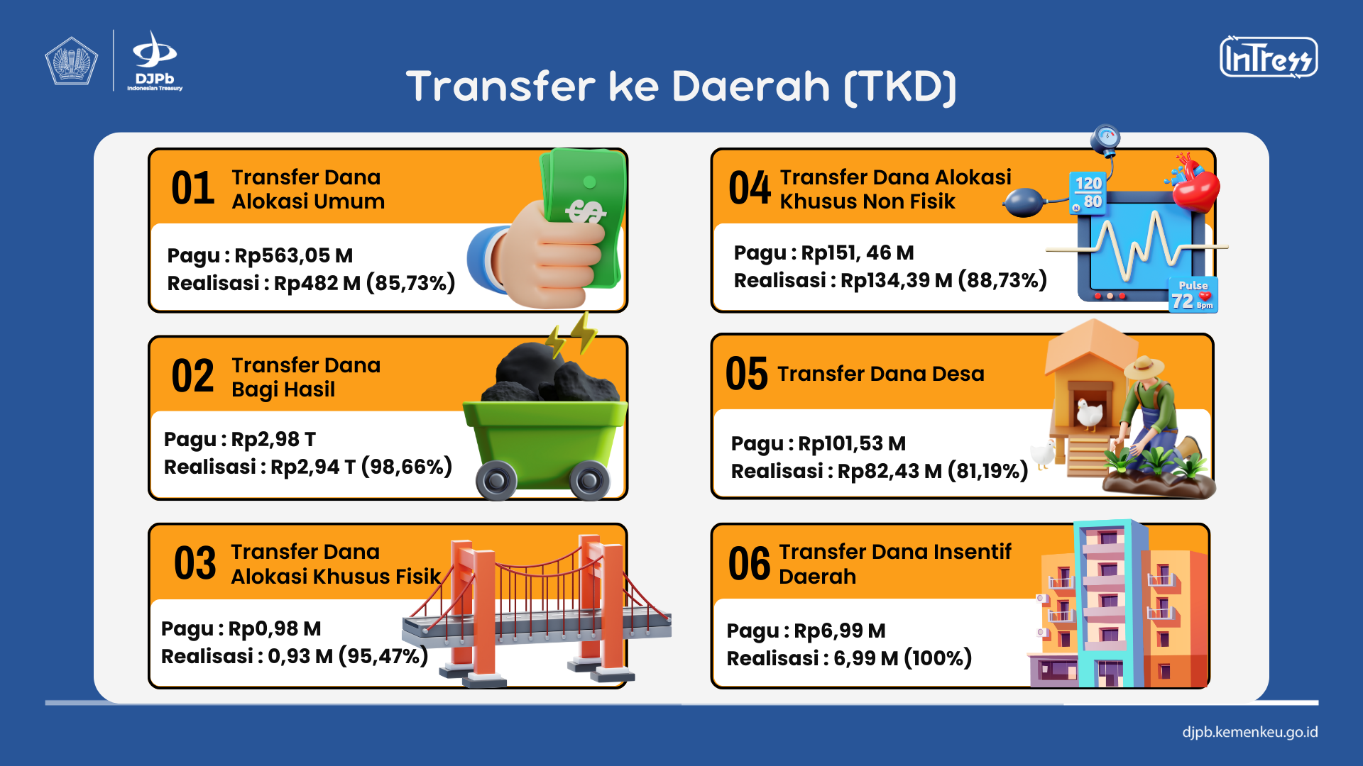 Alokasi Dana Transfer ke Daerah (TKD) untuk Kabupaten Berau yang disalurkan melalui KPPN Tanjung Redeb sebesar 3,81 triliun, setelah mengalami penambahan pagu sebesar 0,4 triliun dari alokasi/pagu awal sebesar 3,40 triliun. Penambahan pagu ini berasal Dana Bagi Hasil (DBH) Kurang Bayar Kabupaten Berau sesuai Keputusan Menteri Keuangan Nomor 29/MK/PK/2025 Tahun 2025 tentang Penyaluran Kurang Bayar Dana Bagi Hasil Tahun 2025. Hingga akhir November 2025 KPPN Tanjungredep menyalurkan TKD sebesar Rp3,65 triliun atau 95,89% dari pagu. Realisasi ini terdiri dari: