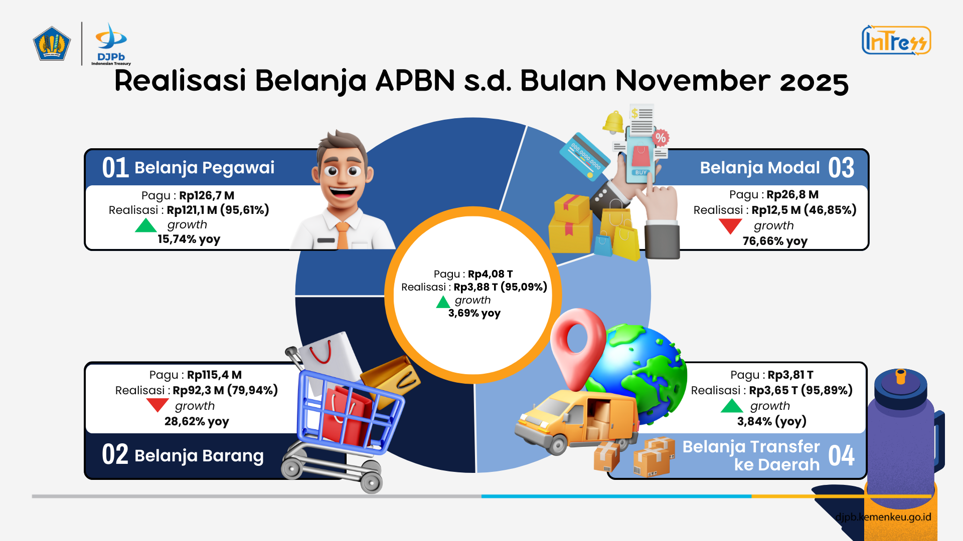 Realisasi belanja sampai dengan Bulan November 2025 yaitu sebesar Rp3,88 triliun (95,09 persen) dari total pagu Rp4,08 triliun dan mengalami kenaikan 3,69% dibandingkan tahun 2024. Belanja Pegawai terealisasi sebesar Rp121,1 miliar (95,61 persen) dari pagu 126,7 miliar dan terjadi pertumbuhan 15,74% (yoy). Belanja Barang terealisasi sebesar Rp92,3 miliar (79,94 persen) dari pagu 115,4 miliar dan terkontraksi 28,62% (yoy). Belanja Modal terealisasi sebesar Rp12,5 miliar (46,85 persen) dari pagu 26,8 miliar dengan negative growth 72,66% (yoy). Belanja Transfer ke Daerah (TKD) telah sesuai dengan jadwal realisasi yang ditetapkan DJPK untuk penyaluran TKD sampai dengan bulan November dengan nilai total realisasi Rp3,65 triliun (95,89 persen) dari pagu Rp3,81 triliun dan memiliki positive growth 3,84% (yoy).