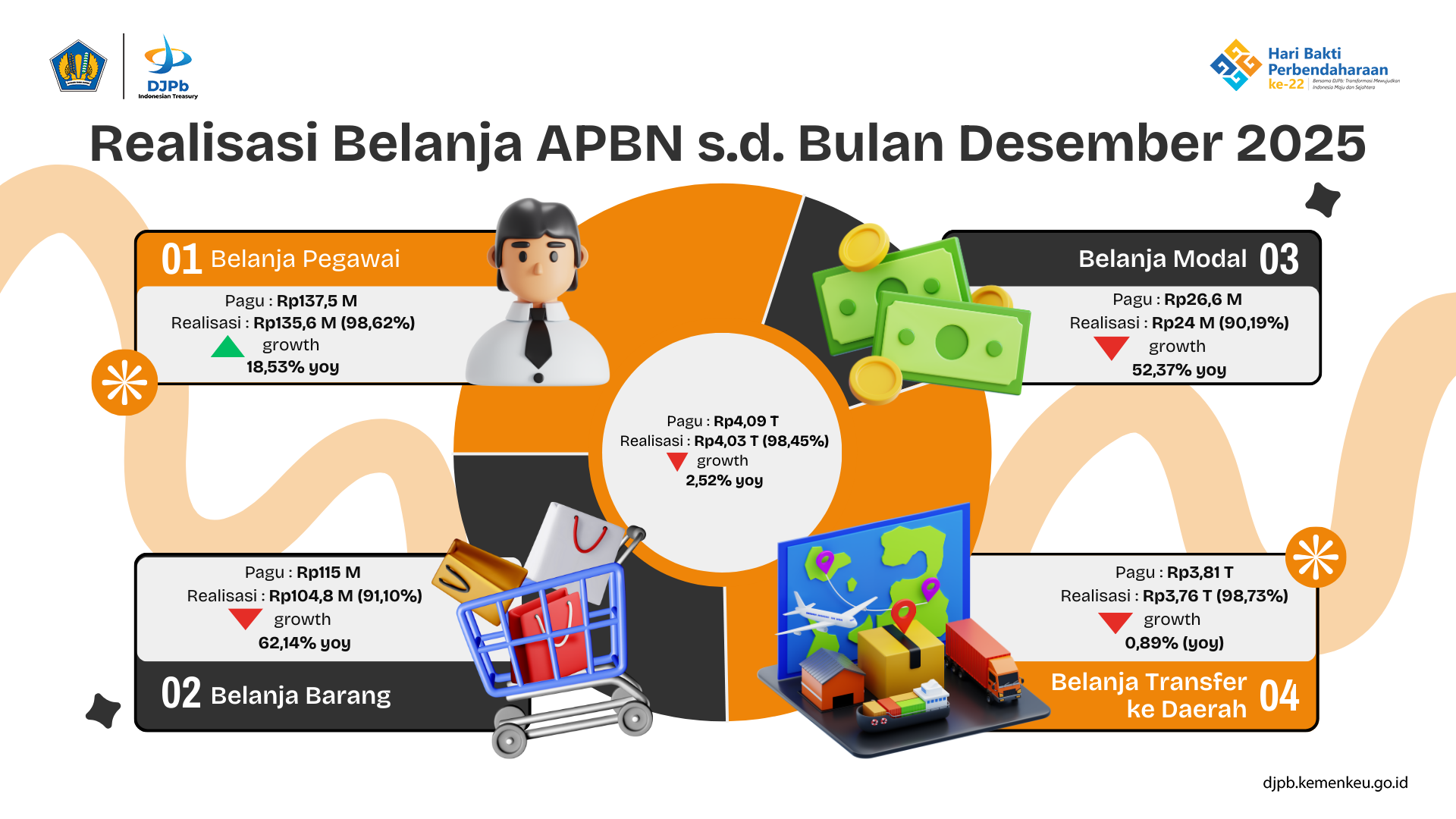 Realisasi belanja sampai dengan Bulan Desember 2025 yaitu sebesar Rp4,03 triliun (98,45 persen) dari total pagu Rp4,09 triliun dan mengalami penurunan 2,52% dibandingkan tahun 2024. Belanja Pegawai terealisasi sebesar Rp135,6 miliar (98,62 persen) dari pagu 137,5 miliar dan terjadi pertumbuhan 18,53% (yoy). Belanja Barang terealisasi sebesar Rp104,8 miliar (91,10 persen) dari pagu Rp115 miliar dan terkontraksi 62,14% (yoy). Belanja Modal terealisasi sebesar Rp24 miliar (90,19 persen) dari pagu 26,6 miliar dengan negative growth 52,37% (yoy). Belanja Transfer ke Daerah (TKD) telah sesuai dengan jadwal realisasi yang ditetapkan DJPK untuk penyaluran TKD sampai dengan bulan Desember dengan nilai total realisasi Rp3,76 triliun (98,73 persen) dari pagu Rp3,81 triliun dan memiliki negative growth 0,89% (yoy).