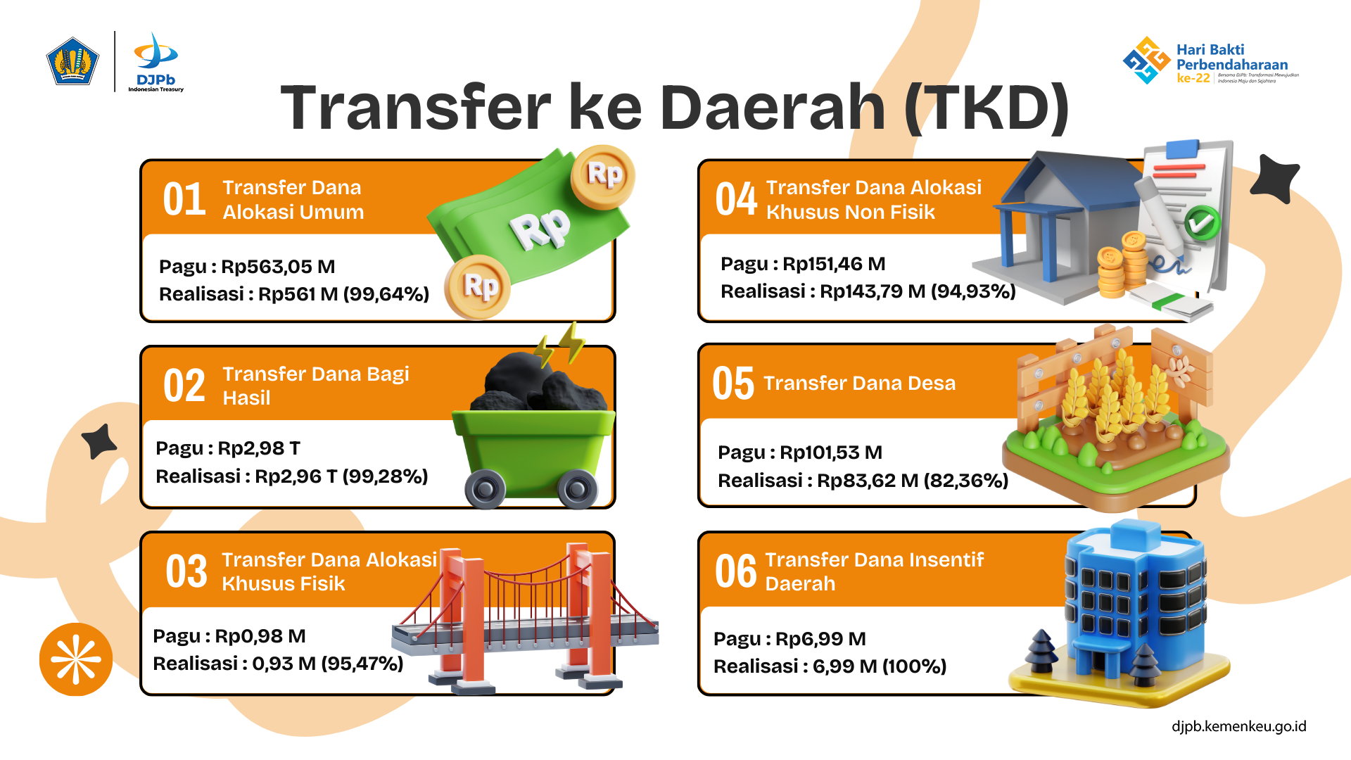 Alokasi Dana Transfer ke Daerah (TKD) untuk Kabupaten Berau yang disalurkan melalui KPPN Tanjung Redeb sebesar 1,65 triliun pada tahun 2026. Hingga akhir Januari 2026 KPPN Tanjungredep menyalurkan TKD sebesar Rp182.011.962.900,- atau 11,86% dari pagu. Realisasi ini terdiri dari: