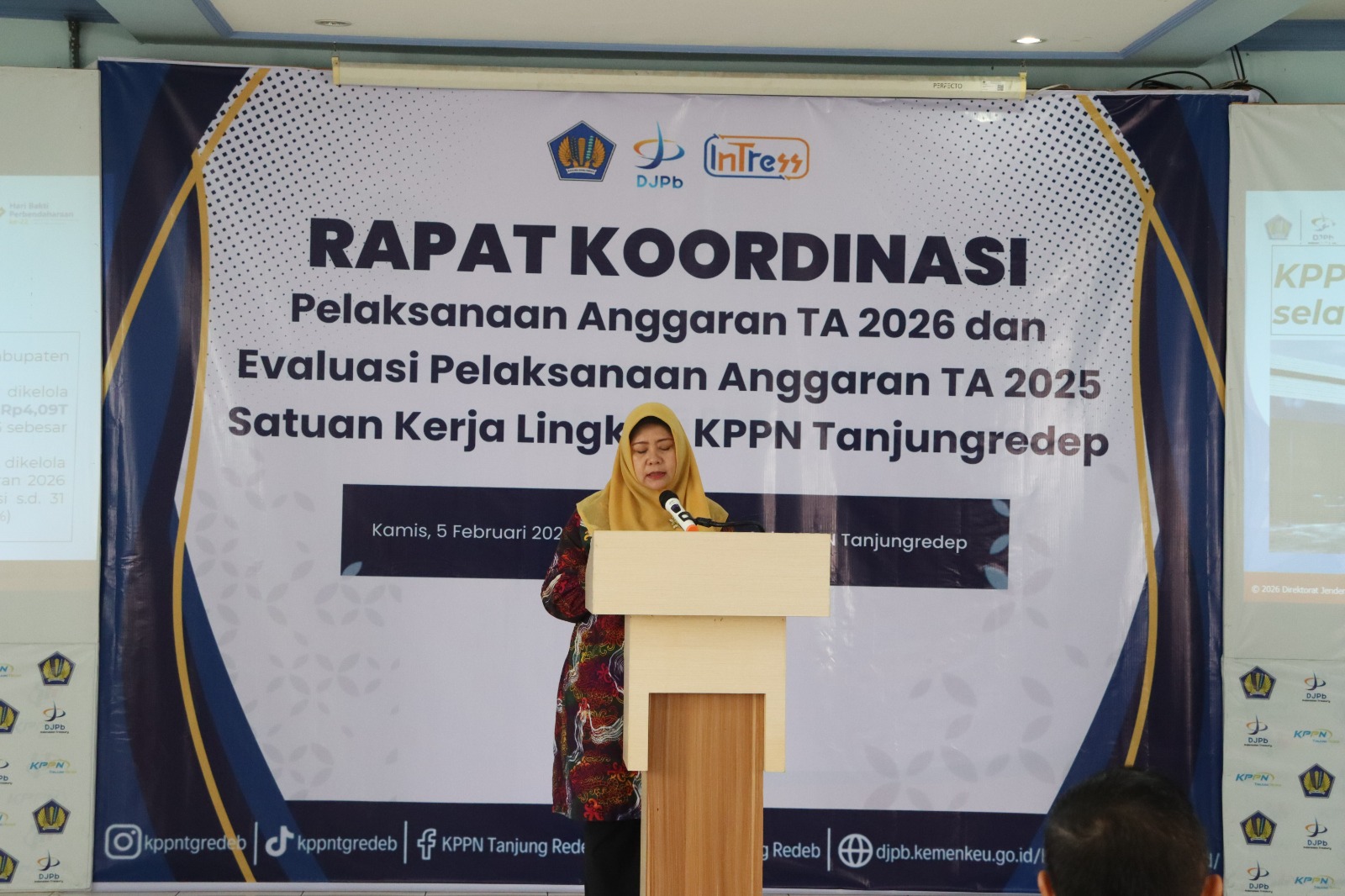 KPPN Tanjung Redep melaksanakan kegiatan Rapat Pelaksanaan Anggaran TA 2026 dan Evaluasi Pelaksanaan Anggaran TA 2025 sekaligus pemberian penghargaan kepada Satker Berprestasi pada Semester II Tahun 2025 pada hari Kamis tanggal 5 Februari 2026 bertempat di Aula KPPN Tanjung Redep. Kegiatan ini dihadiri oleh Bapak Edih Mulyadi, Kepala Kanwil DJPB Provinsi Kalimantan Timur dan Para Kuasa Pengguna Anggaran (KPA) beserta para Pengelola Keuangan pada Satuan Kerja wilayah kerja KPPN Tanjung Redep.