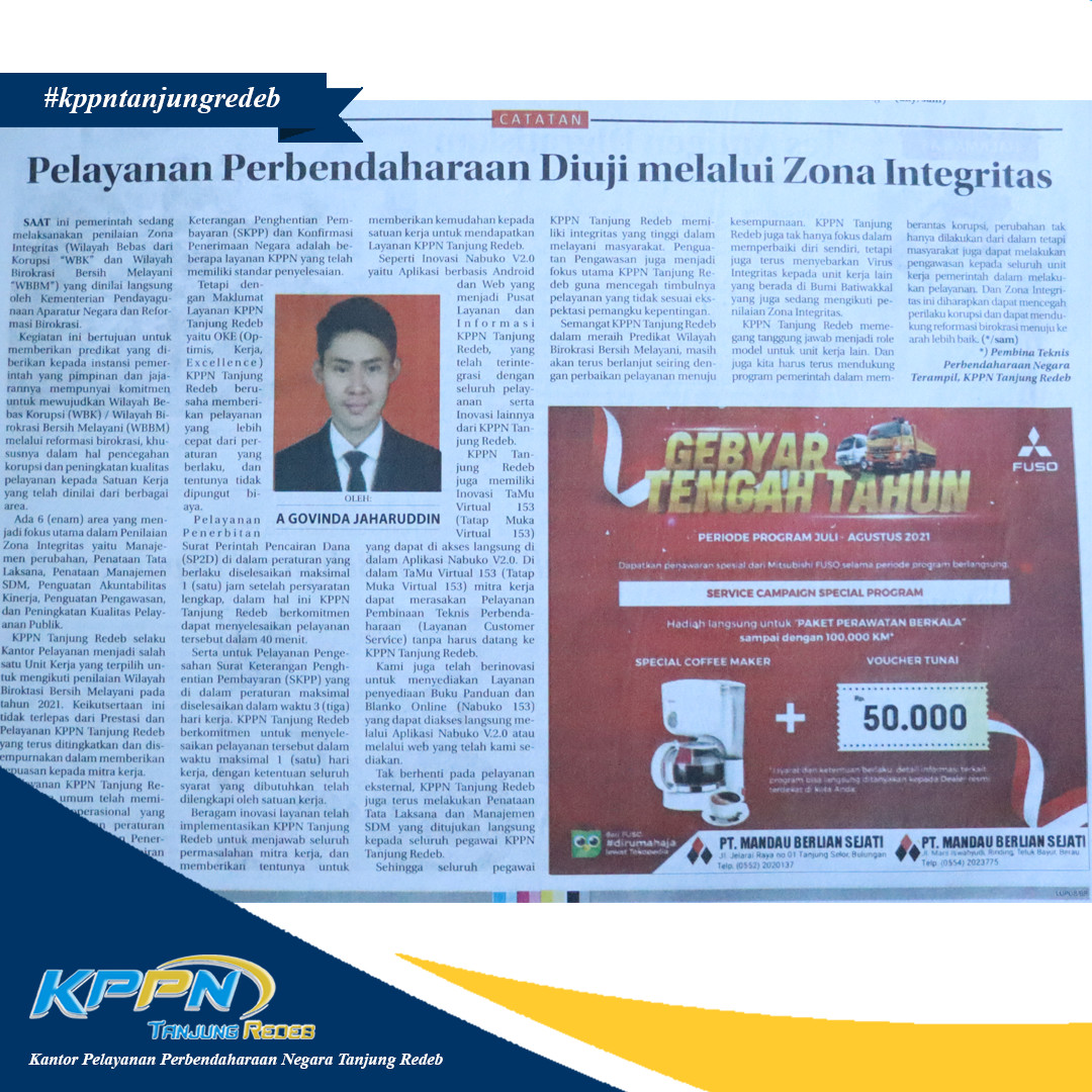 KPPN Tanjung Redeb selaku selaku penyalur DAK Fisik dan Dana Desa berkomitmen penuh dan siap mengawal percepatan penyaluran DAK Fisik dan Dana Desa di Kab. Berau secara akurat, optimal, dan tepat waktu.