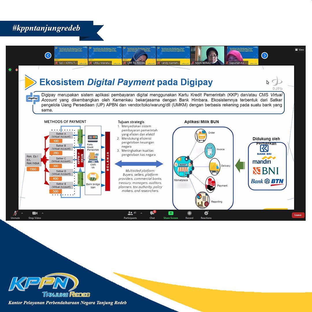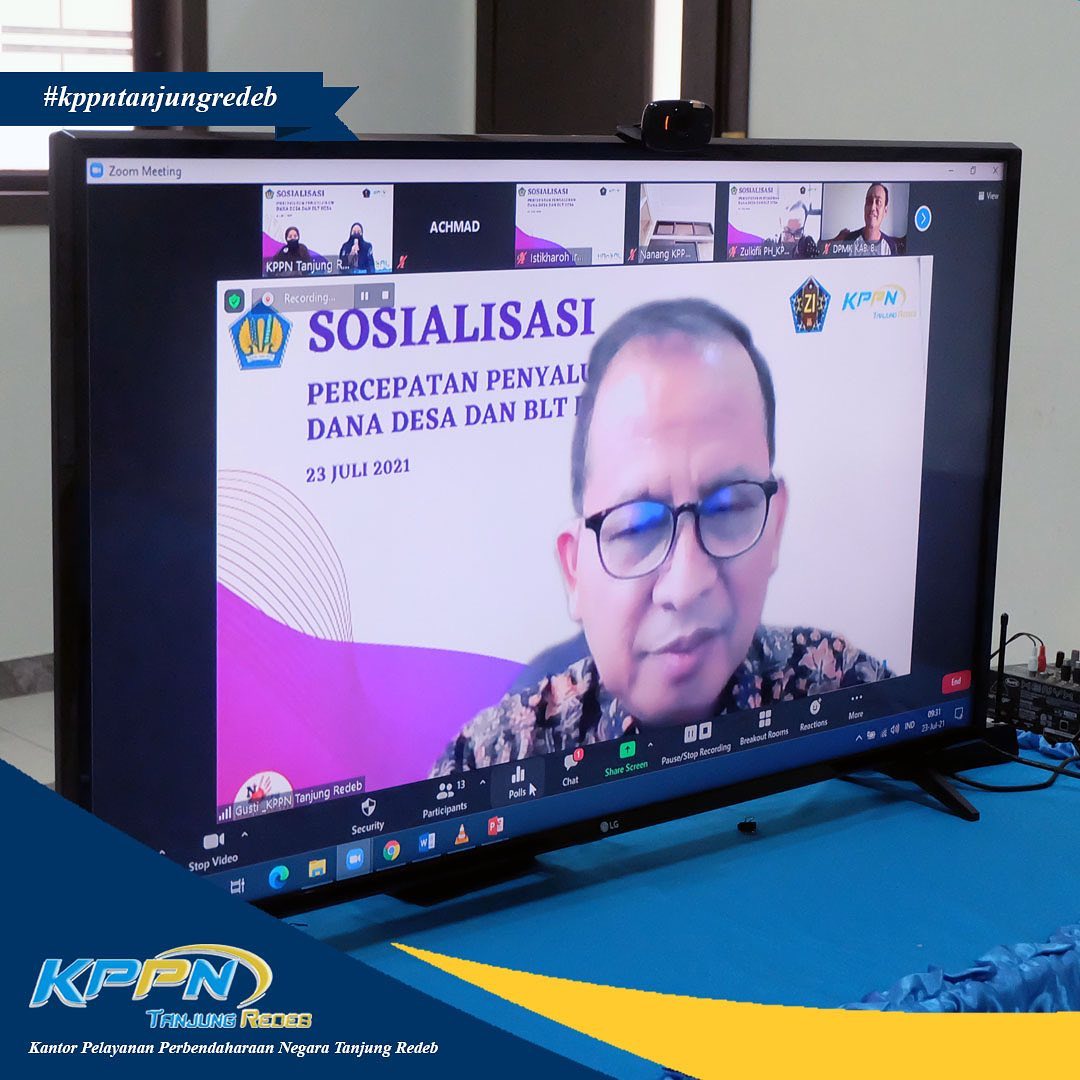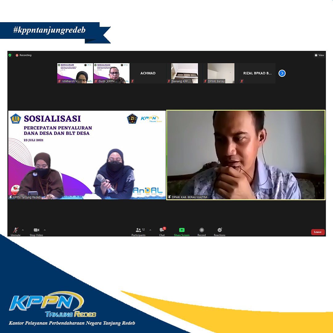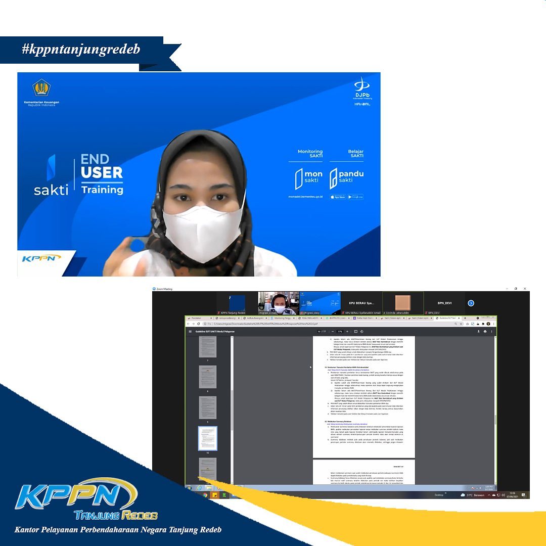 Dalam rangka menyukseskan implementasi secara penuh (roll out) SAKTI yang akan dimulai pada akhir tahun 2021, Kantor Pelayanan Perbendaharaan Negara Tanjung Redeb melaksanakan kegiatan End User Training (EUT) SAKTI. Kegiatan ini diikuti oleh seluruh calon pengguna SAKTI dari 25 satuan kerja non piloting lingkup KPPN Tanjung Redeb yang dilaksanakan pada tanggal 30 Agustus s.d. 10 September 2021 mulai pukul 08.00 s.d. 17.00 WITA secara daring melalui video conference.
