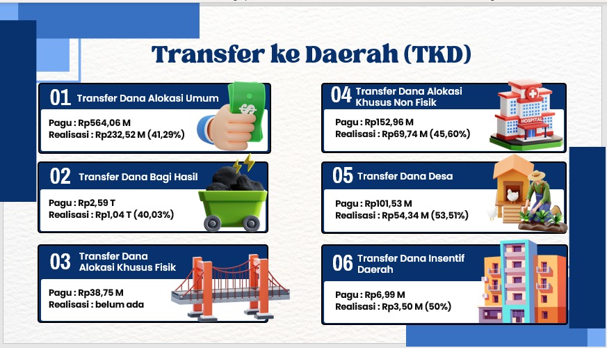 Alokasi Dana Transfer ke Daerah (TKD) untuk Kabupaten Berau yang disalurkan melalui KPPN Tanjung Redeb sebesar 3,82 triliun, setelah mengalami penambahan pagu sebesar 0,4 triliun dari alokasi/pagu awal sebesar 3,40 triliun. Penambahan pagu ini berasal Dana Bagi Hasil (DBH) Kurang Bayar Kabupaten Berau sesuai Keputusan Menteri Keuangan Nomor 29/MK/PK/2025 Tahun 2025 tentang Penyaluran Kurang Bayar Dana Bagi Hasil Tahun 2025. Hingga akhir Oktober 2025 KPPN Tanjungredep menyalurkan TKD sebesar Rp3,10 triliun atau 81,30% dari pagu. Realisasi ini terdiri dari: