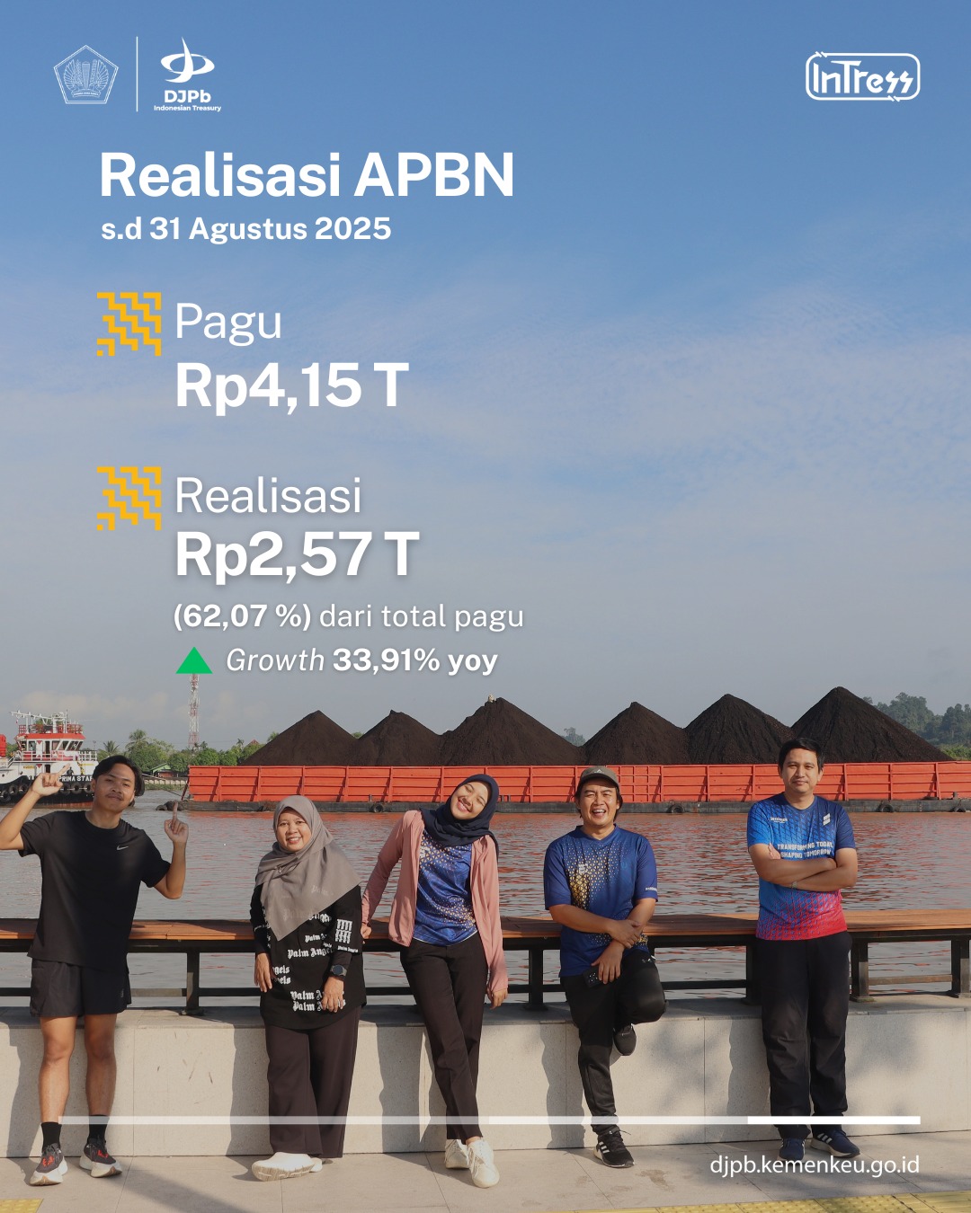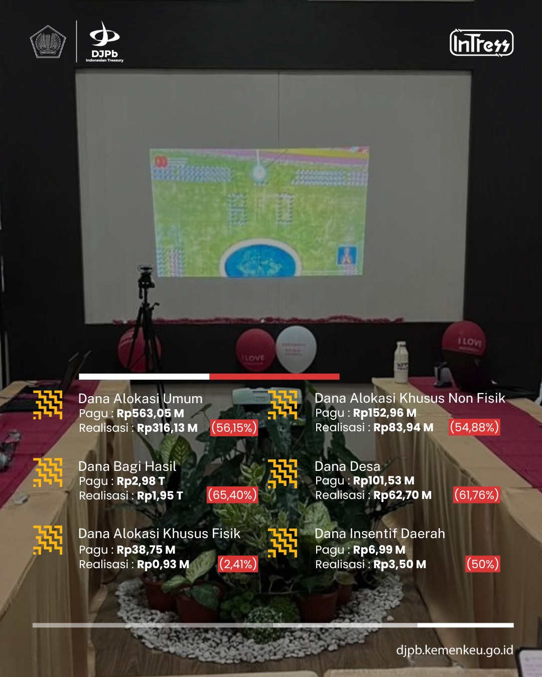 - Dana Alokasi Khusus Non Fisik dengan pagu Rp152,96 miliar telah direalisasikan sebesar Rp109,95 miliar atau 71,88%.