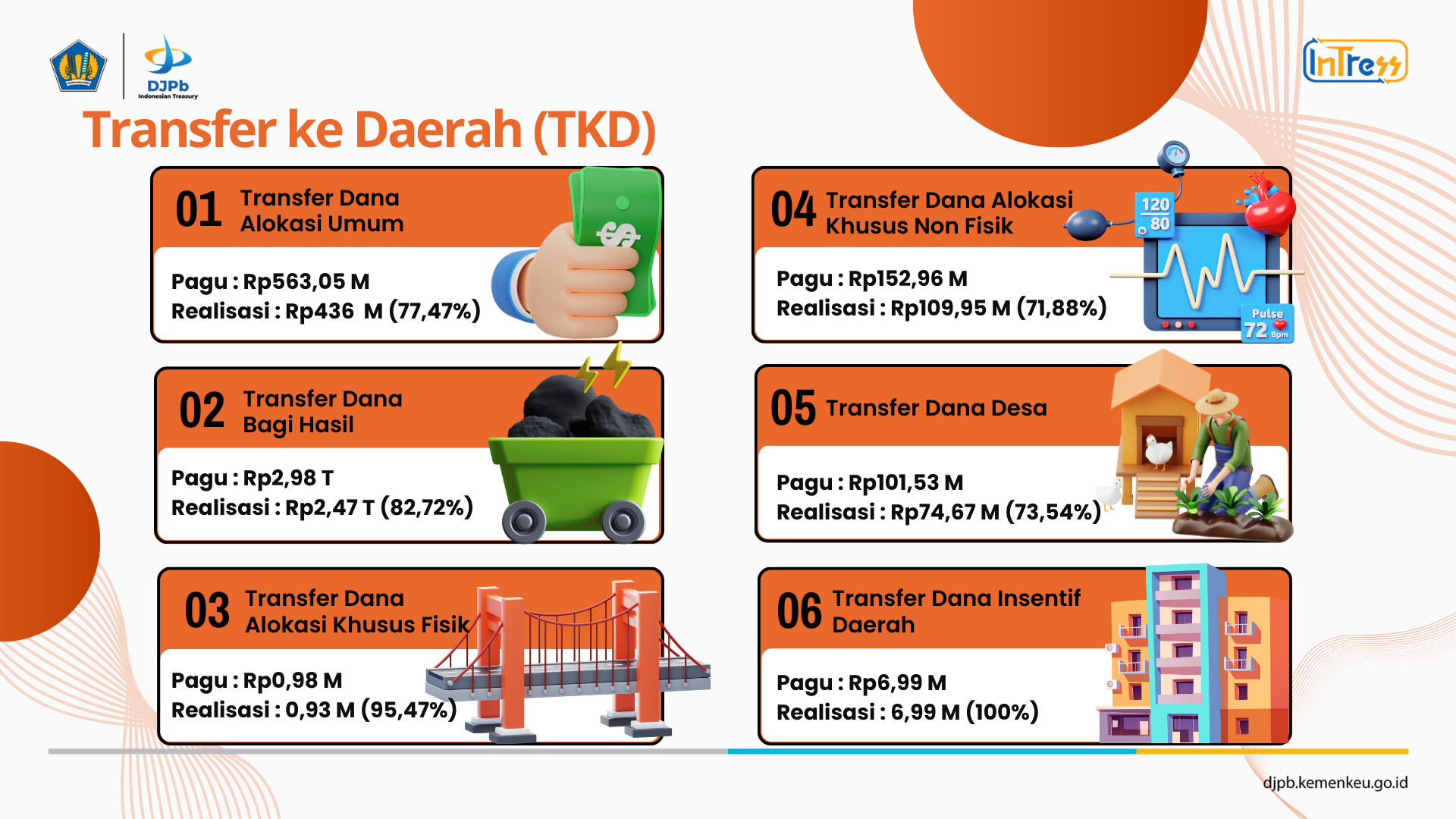 - Dana Alokasi Khusus Non Fisik dengan pagu Rp152,96 miliar telah direalisasikan sebesar Rp109,95 miliar atau 71,88%.