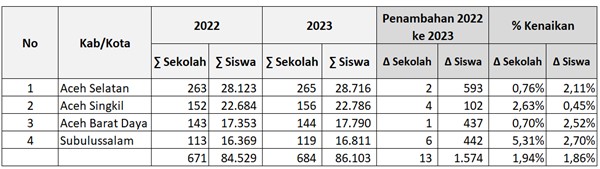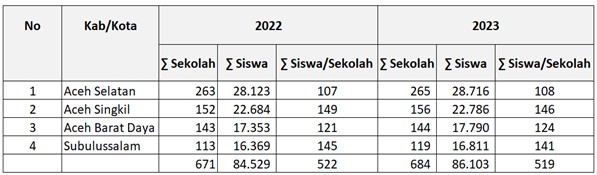 Dari tabel 3 tersebut terlihat bahwa jumlah siswa di Kabupaten Aceh Selatan adalah terbanyak apabila dibandingkan dengan tiga kabupaten/kota lainnya, pada tahun 2022 jumlah peserta didik adalah sebanyak 28.123 siswa yang bersekolah di 263 sekolah, sedangkan pada tahun 2023 adalah sebanyak 28.716 yang bersekolah di 265 sekolah, diikuti secara berturut-turut oleh Kabupaten Aceh Singkil, Kabupaten Aceh Barat Daya, dan Kota Subulussalam.