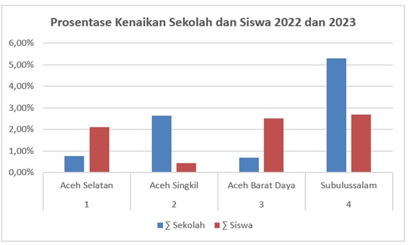 Dari tabel dan grafik tersebut terlihat dua kondisi yang berbeda antara tahun 2022 dan tahun 2023. Kondisi pertama kenaikan jumlah sekolah diikuti dengan kenaikan jumlah peserta didik, dan kondisi kedua kenaikan jumlah sekolah namun terdapat penurunan jumlah peserta didik. Kondisi pertama terjadi di Kabupaten Aceh Selatan dan Kabupaten Aceh Barat Daya, untuk Kabupaten Aceh Selatan secara prosentase kenaikan jumlah sekolah sebesar 0,76% (2 sekolah) diikuti dengan kenaikan jumlah peserta didik sebesar 2,11% atau 593 peserta didik, sedangkan untuk Kabupaten Aceh Barat Daya kenaikan jumlah sekolah sebesar 0,70% (1 sekolah) diikuti dengan kenaikan jumlah peserta didik sebesar 2,52% atau 437 peserta didik. Kondisi tersebut tentu adalah kondisi yang ideal yaitu dengan penambahan jumlah peserta didik terdapat juga penambahan jumlah sekolah. Kondisi kedua, terdapat kenaikan jumlah sekolah namun tidak diikuti dengan kenaikan jumlah peserta didik, kondisi terjadi di Kabupaten Aceh Singkil, dan Kota Subulussalam.