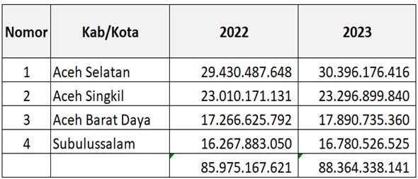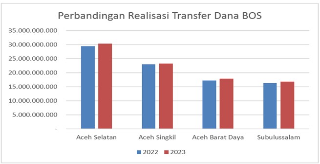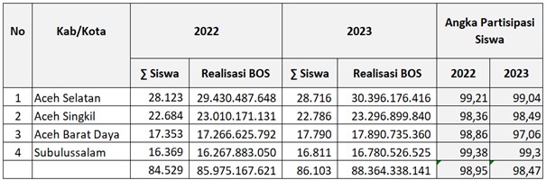 - Realisasi transfer Dana BOS reguler untuk pendidikan dasar Kabupaten Aceh Selatan tahun 2023 adalah Rp30,3 miliar untuk 28.716 peserta didik, atau mengalami kenaikan sebesar 3,3% apabila dibandingkan dengan tahun 2022 sebesar Rp29,4 miliar untuk 28.123 peserta didik, disusul Kabupaten Aceh Singkil sebesar Rp23 miliar untuk 22.684 pada tahun 2022 dan sebesar Rp23,2 miliar pada tahun 2023 untuk 22.786 peserta didik, selanjutnya Kabupaten Aceh Barat Daya, pada tahun 2022 realisasi transfer dana BOS-nya adalah Rp17,89 miliar untuk 17.353 peserta didik pada tahun 2023 dan tahun 2022 sebesar Rp17,2 miliar untuk 17.790 peserta didik, dan terakhir Kota Subulussalam tranfer dana BOS tahun 2023 adalah sebesar Rp16,78 miliar untuk 16.369, tahun 2022 sebesar Rp16,2 miliar untuk 16.811 peserta didik.