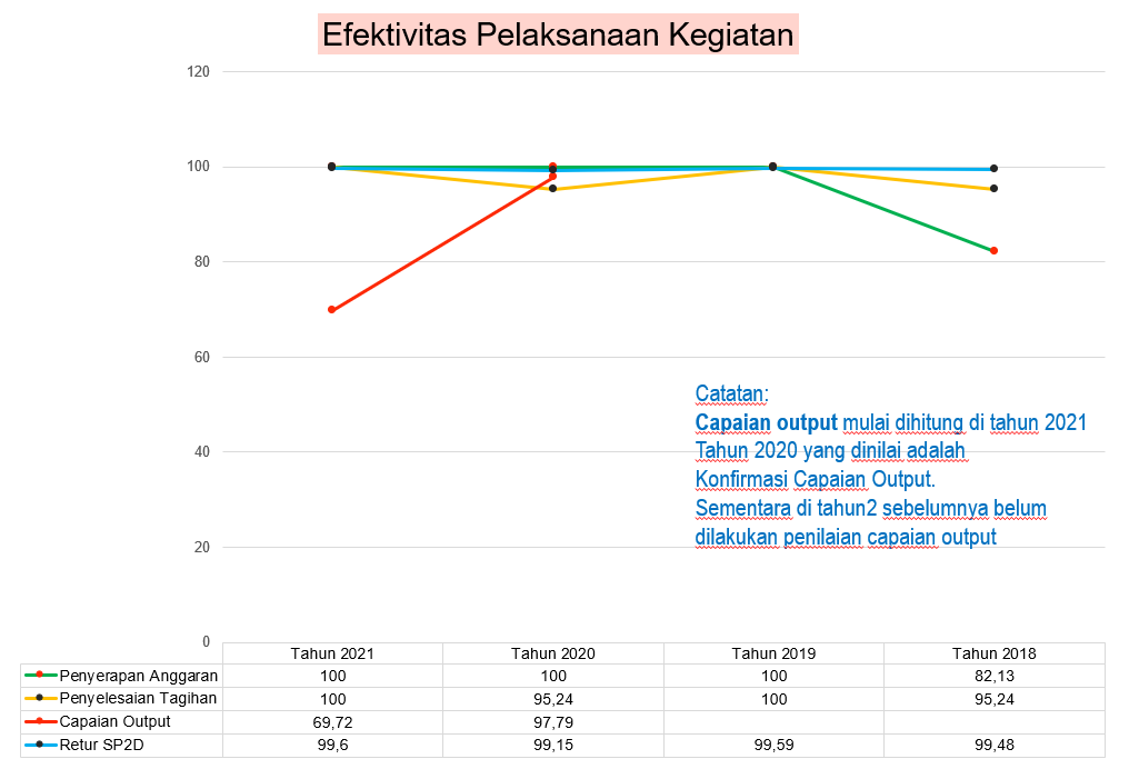 Penyerapan Anggaran adalah indikator yang menunjukkan Persentase penyerapan anggaran atas pagi DIPA terhadap target Penyerapan Anggaran Triwulan. Penyelesaian Tagihan adalah indikator yang menggmbarkan rasio antara penyampaian SPM LS kontraktual Non Belanja Pegawai yang tepat waktu (17 hari kerja) terhadap seluruh SPM LS Non Kontraktual Non Belanja Pegawai yang disampaikan kepada KPPN. Konfirmasi Capaian Output adalah indikator yang dihitung berdasarkan rasio antara jumlah output yang terkonfirmasi terhadap seluruh output yang di Kelola satker. Retur SP2D adalah indikator yang dihitung berdasarkan rasio antara jumlah SP2D yang di retur terhadap jumlah SP2D yang telah diterbitkan oleh KPPN.