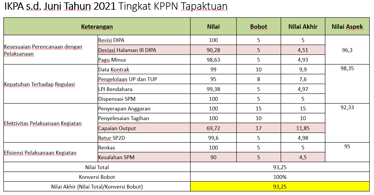 Indikator-indikator tersebut dapat diamati melalui aplikasi Online Monitoring Sistem Perbendaharaan dan Anggaran Negara (OMSPAN). Berdasarkan data OMSPAN, nilai IKPA Semester I Tahun 2021 tingkat KPPN adalah sebesar 93,25 dari 100. Tentunya hal ini masih terbuka ruang untuk peningkatan.