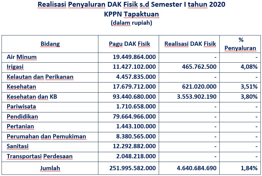 Realisasi DAK Fisik Tahun 2020 untuk Kabupaten/Kota wilayah kerja KPPN Tapaktuan untuk 11 (sebelas) bidang kegiatan, sebagaimana tabel berikut.
