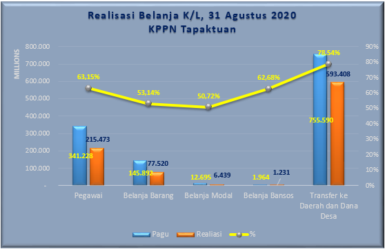 Secara keseluruhan realisasi belanja negara pada KPPN Tapaktuan sampai dengan akhir September 2020 mencapai Rp985.610.366.902 atau 78,14% dari pagu anggaran sebesar Rp1.261.404.935.000 dan bila dibandingkan dengan periode yang sama pada tahun 2019, realisasi belanja tersebut mengalami kenaikan sebesar Rp150.340.732.028 atau 18%. Capaian realisasi sebesar 78,14% tersebut juga mengalami kenaikan yang cukup berarti bila dibanding dengan tahun 2019 yang hanya mencapai 56,44%.