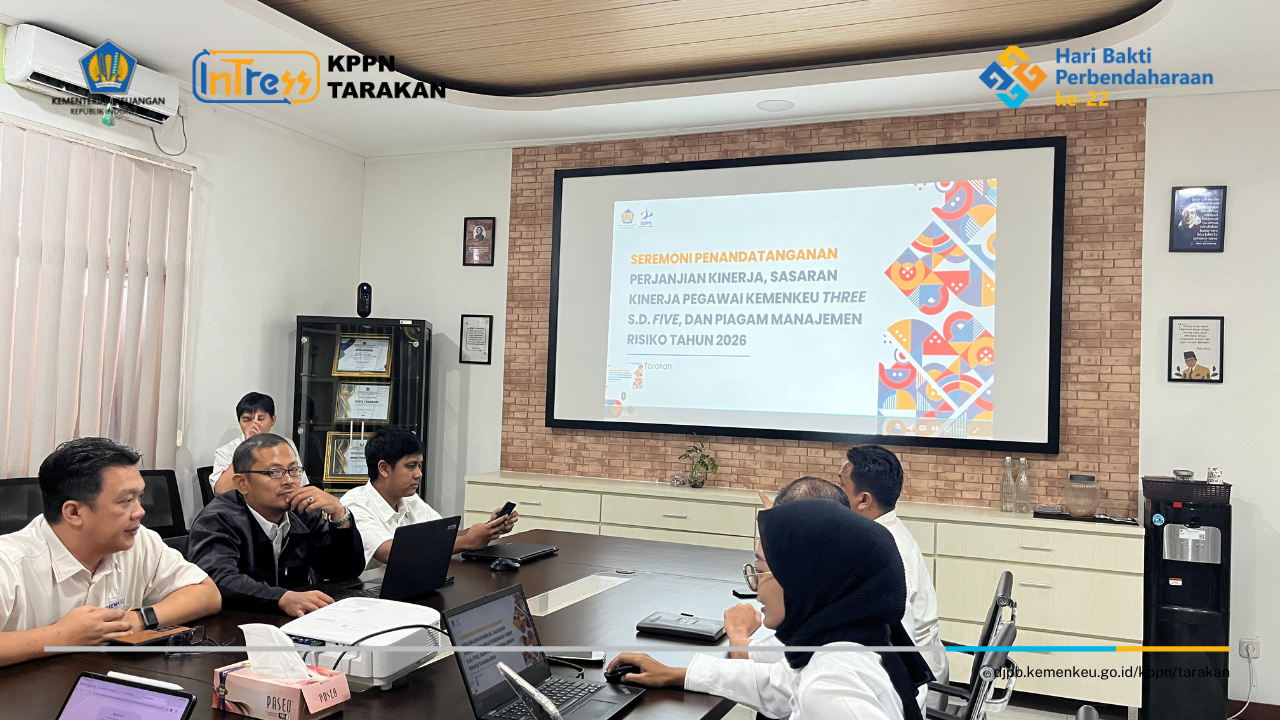 Kantor Pelayanan Perbendaharaan Negara (KPPN) Tipe A2 Tarakan melaksanakan kegiatan Seremoni Penandatanganan Perjanjian Kinerja Kemenkeu-Three, Sasaran Kinerja Pegawai Kemenkeu-Three s.d. Five, serta Piagam Manajemen Risiko Lingkup KPPN Tarakan Tahun 2026 pada Senin, 2 Februari 2026. Kegiatan ini dilaksanakan di Ruang Rapat KPPN Tarakan dan diikuti oleh seluruh pejabat dan pegawai KPPN Tarakan.