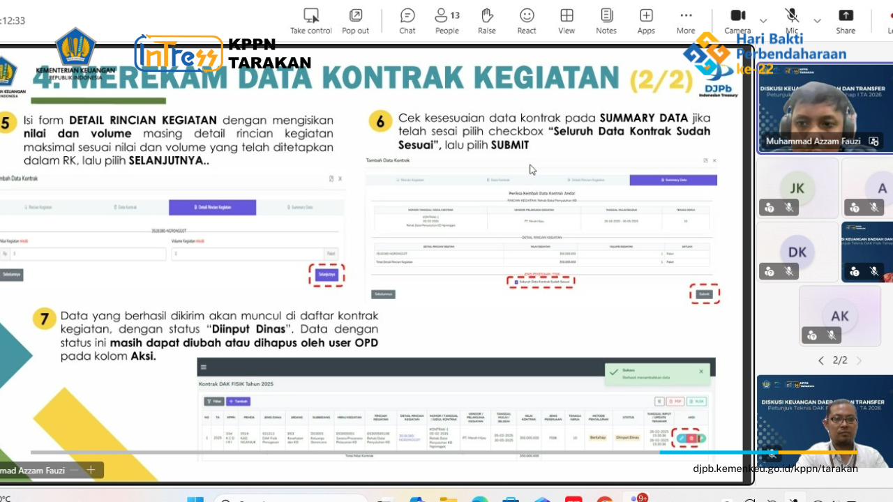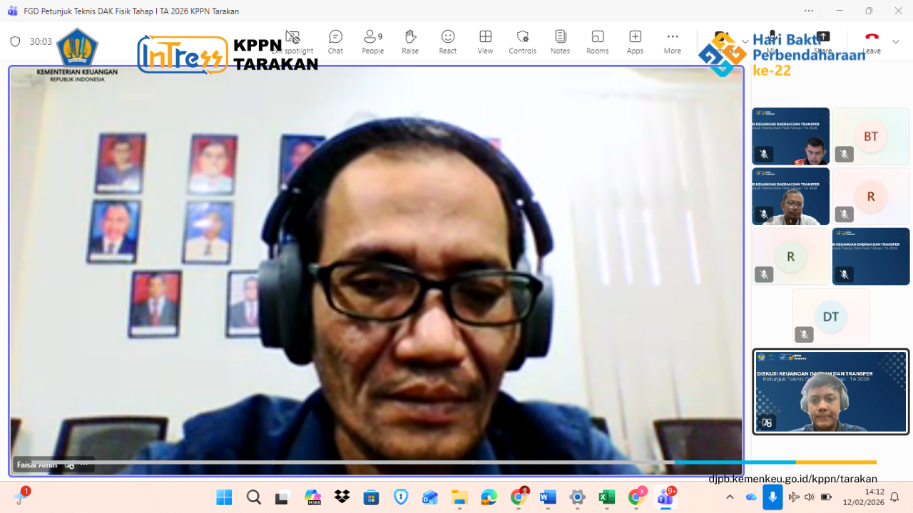 Kamis, 12 Februari 2026, KPPN Tarakan telah melaksanakan Diskusi Keuangan Daerah dan Transfer (DISKET) Edisi Februari 2026: Petunjuk Teknis Penyaluran DAK Fisik Tahap I dan Panduan Aplikasi OMSPAN TKD Modul DAK Fisik TA 2026 secara daring di Ruang Rapat MS Teams KPPN Tarakan bersama Pemda Kota Tarakan dan Pemda Kabupaten Tana Tidung yang diwakili oleh Pegawai/Operator Penyaluran DAK Fisik BPKPAD Kota Tarakan, BPKAD Kabupaten Tana Tidung, Rumah Sakit Umum Kota Tarakan, dan Dinas Pekerjaan Umum dan Penataan Ruang Kabupaten Tana Tidung.